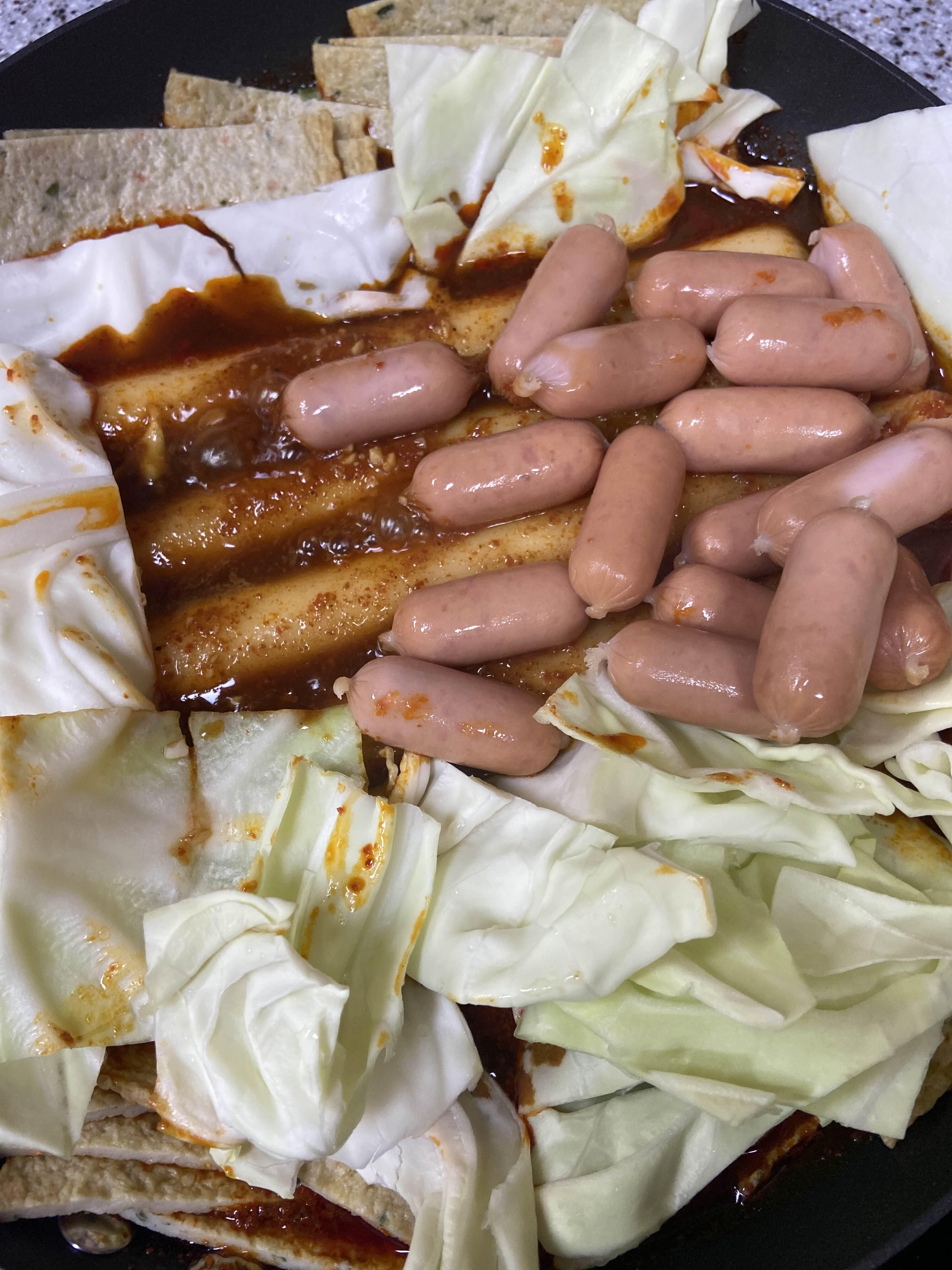 떡, 양배추, 어묵, 대파, 비엔나 소세지, 소스-[올리브유, 고춧가루, 물, 대체당, 치킨스톡 or 연두, 후추, 다진마늘, 카레가루]