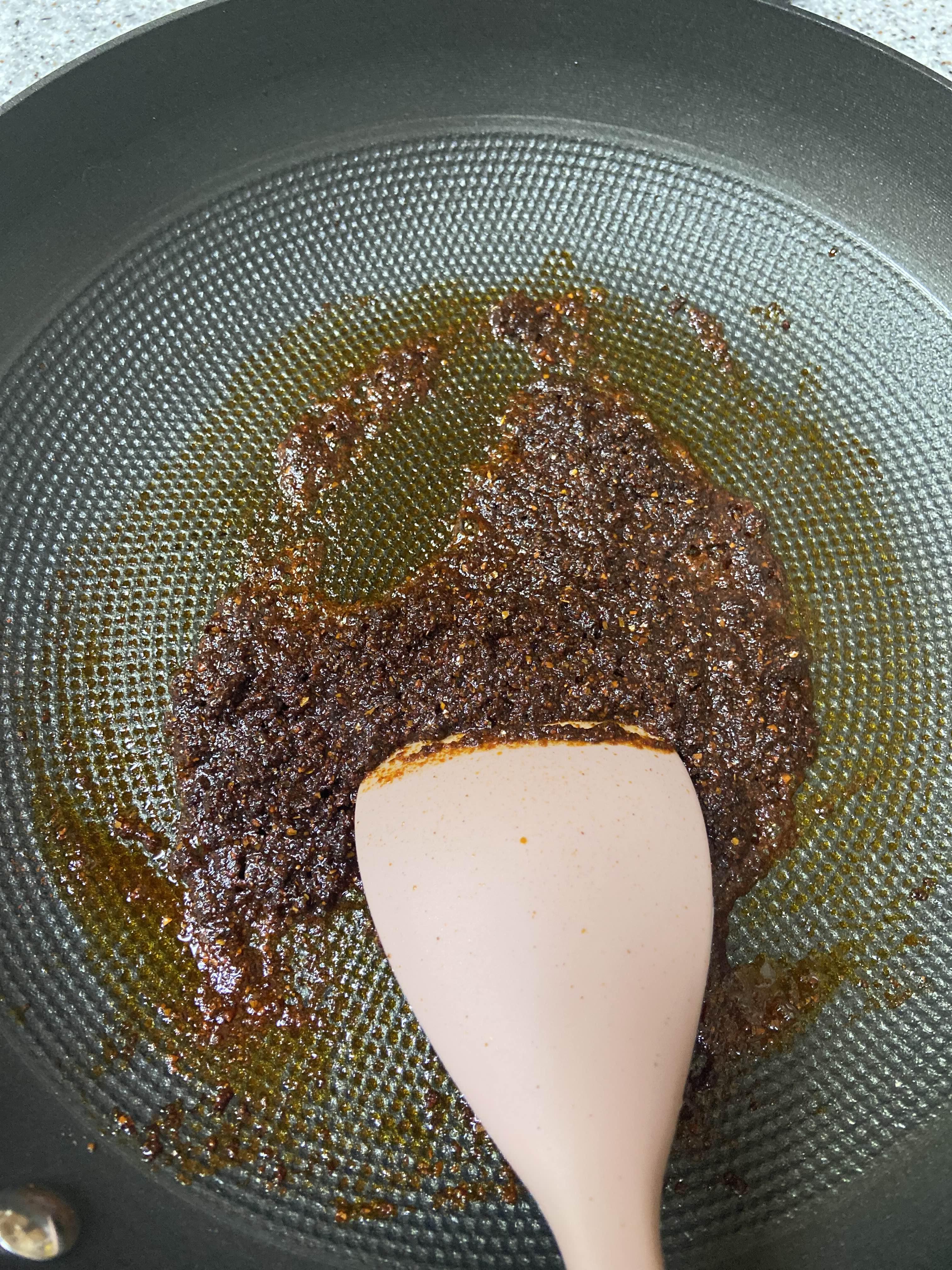 1. 팬에 올리브유를 두바퀴정도 두르고 고춧가루 5스푼을 넣고 볶는다. 볶다가 간장 한스푼을 넣고 다시 볶는다. 여기에서 약불로 고춧가루가 타지 않게 볶도록 주의해야한다. 나는 팬 색이 어두워서 타는 줄 모르고 볶아버려서 탄 맛이 났다. 기름을 너무 많이 넣으면 나처럼 되지만 기름을 적당히 넣으면 보슬보슬하게 볶아진다.