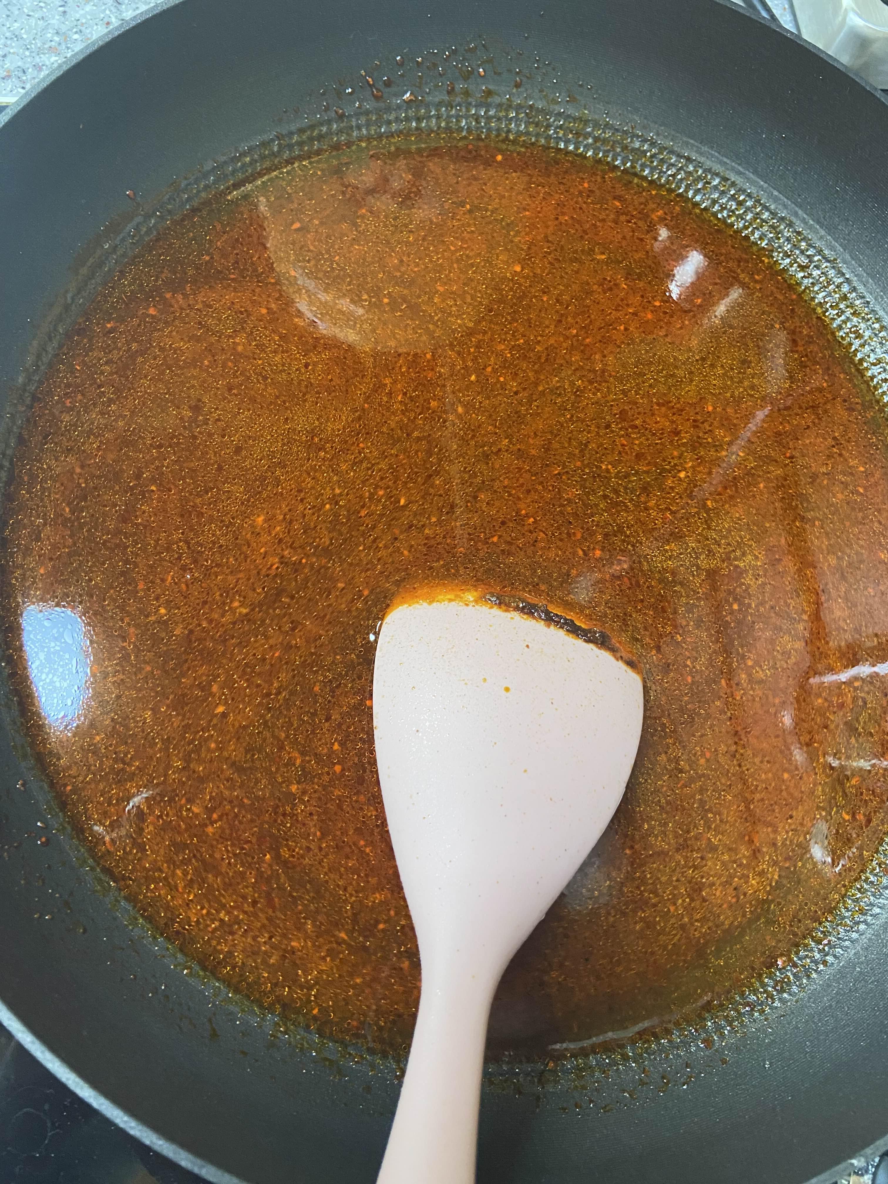 2. 물 2컵, 종이컵보다 크면 1컵 반 넣고 연두 1스푼, 후추, 다진마늘 한 스푼, 대체당으로 대추야자 시럽 4스푼을 넣고 중약불로 끓인다. 알룰로스, 스테비아 설탕을 넣어도 된다. 물론 더 맛있으려면 설탕을 넣어도 된다눙,, 나는 이유식 설탕으로 쓰인다는 대추야자 시럽을 넣었더니 색이 어두워지긴 했다.