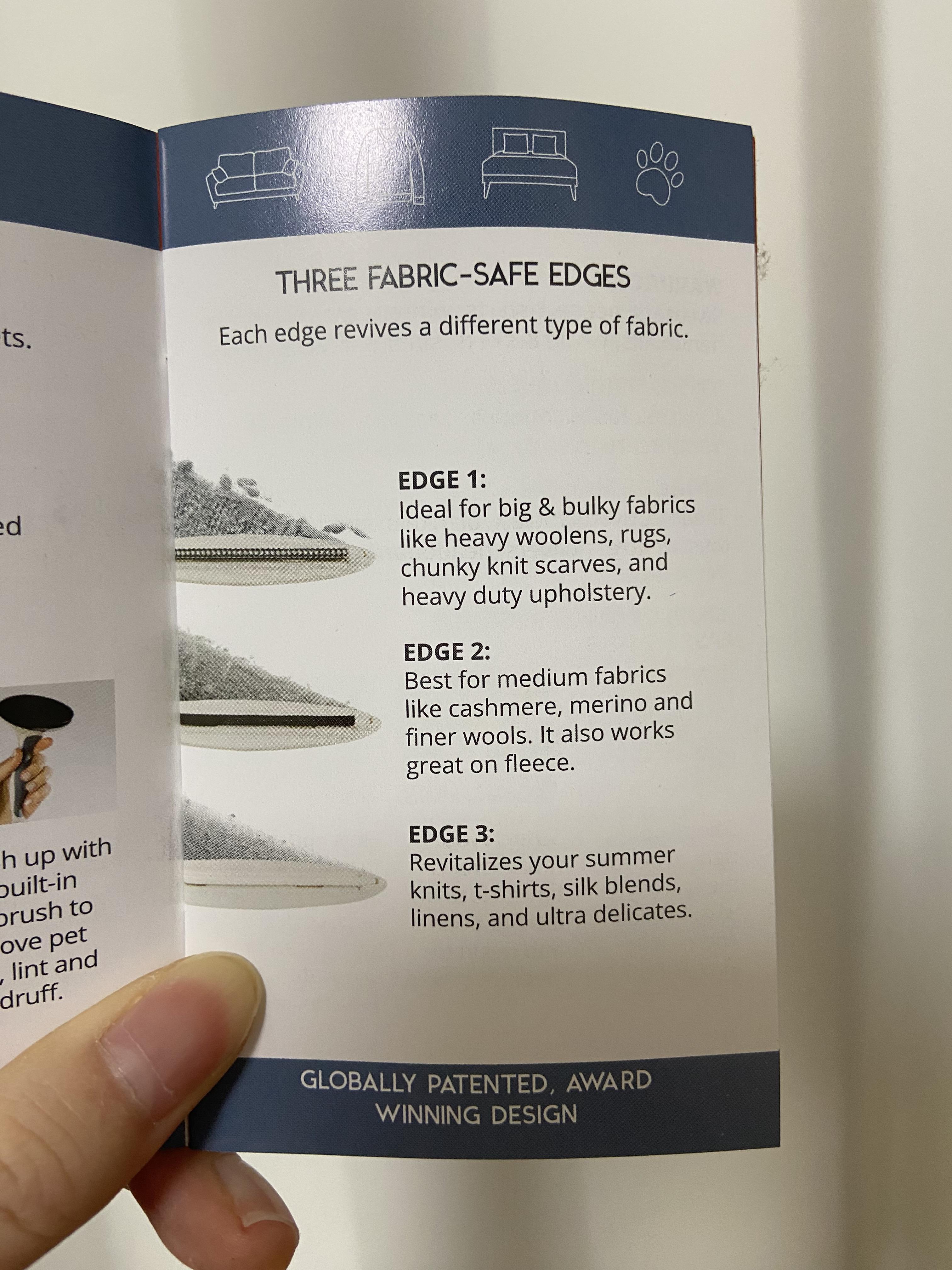 바닥에 펼쳐서 보풀 제거를 하려는 곳의 면의 위쪽을 빤빤하게 당기고 밀어주면서 사용한다.