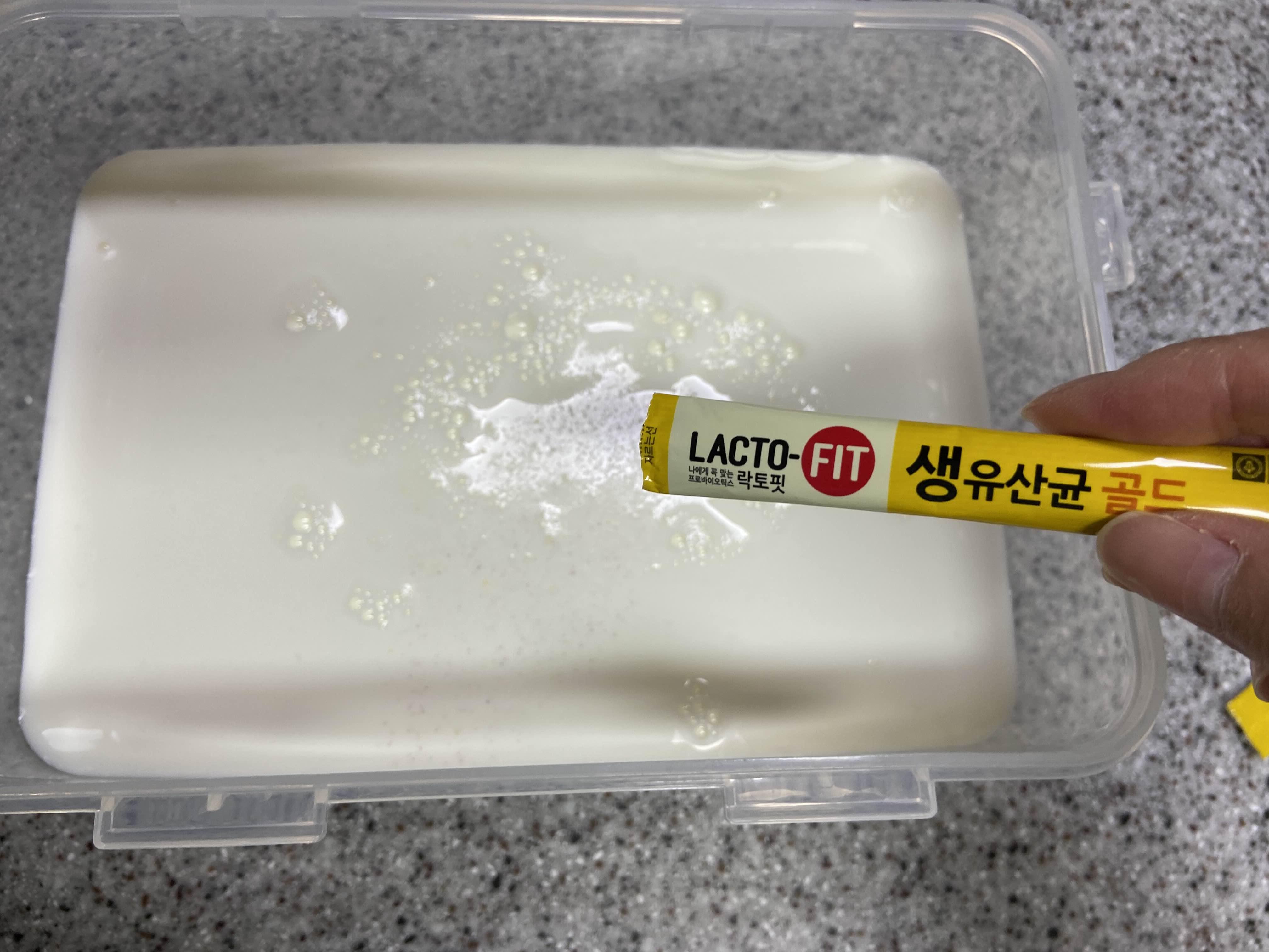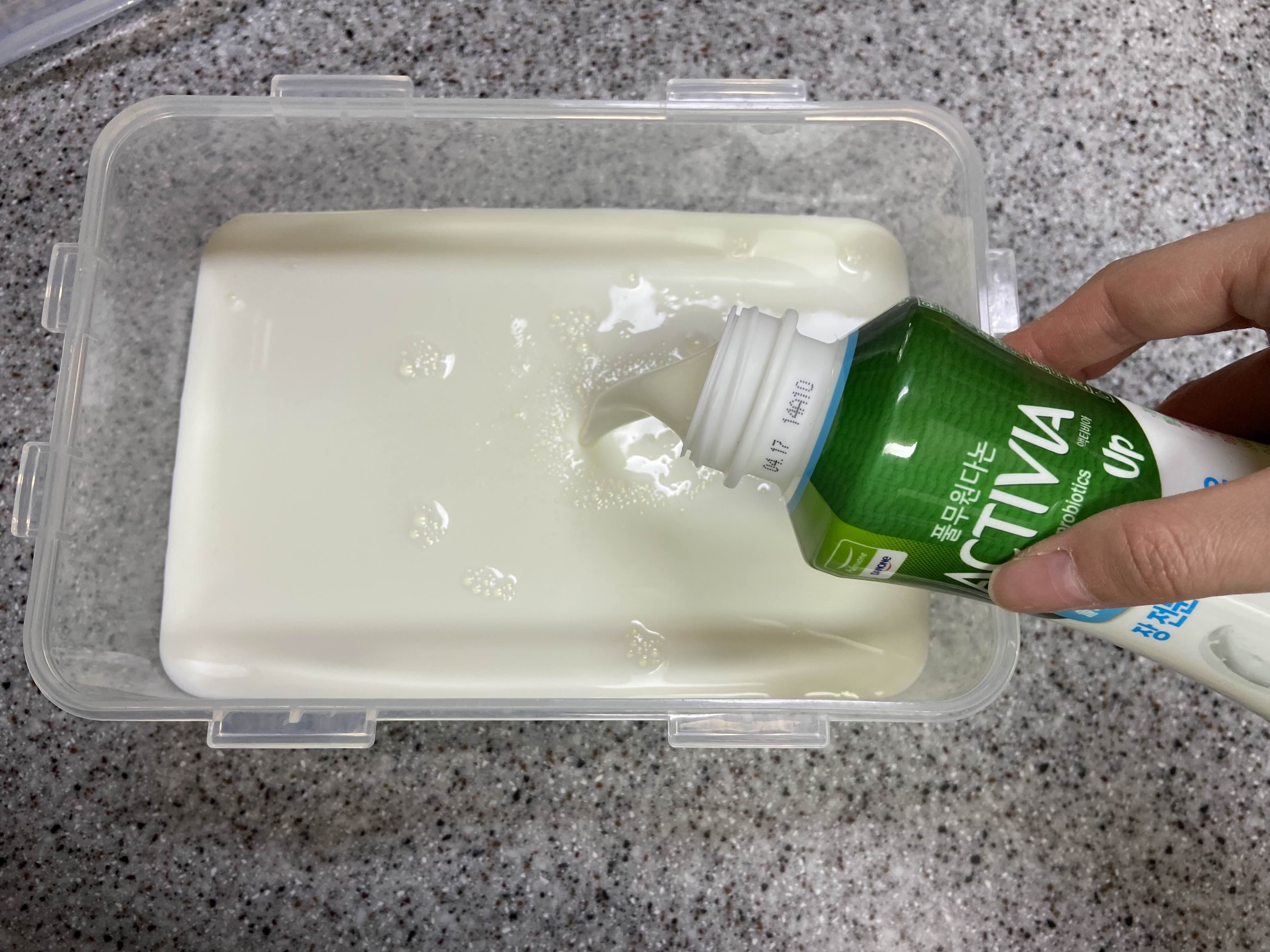 1. 통에 우유 한통과 불가리스를 넣고 잘 섞어준다. 나는 엑티비아를 사용했는데 경험상 불가리스가 제일 잘 만들어지는 것 같다. 엑티비아도 만들어지긴 하는데 좀 더 묽은 느낌? 그리고 유산균 가루가 있다면 함께 넣어줘도 좋다. 평소에 잘 안 챙겨먹는 유산균을 요거트와 함께 먹으면 좋으니까.