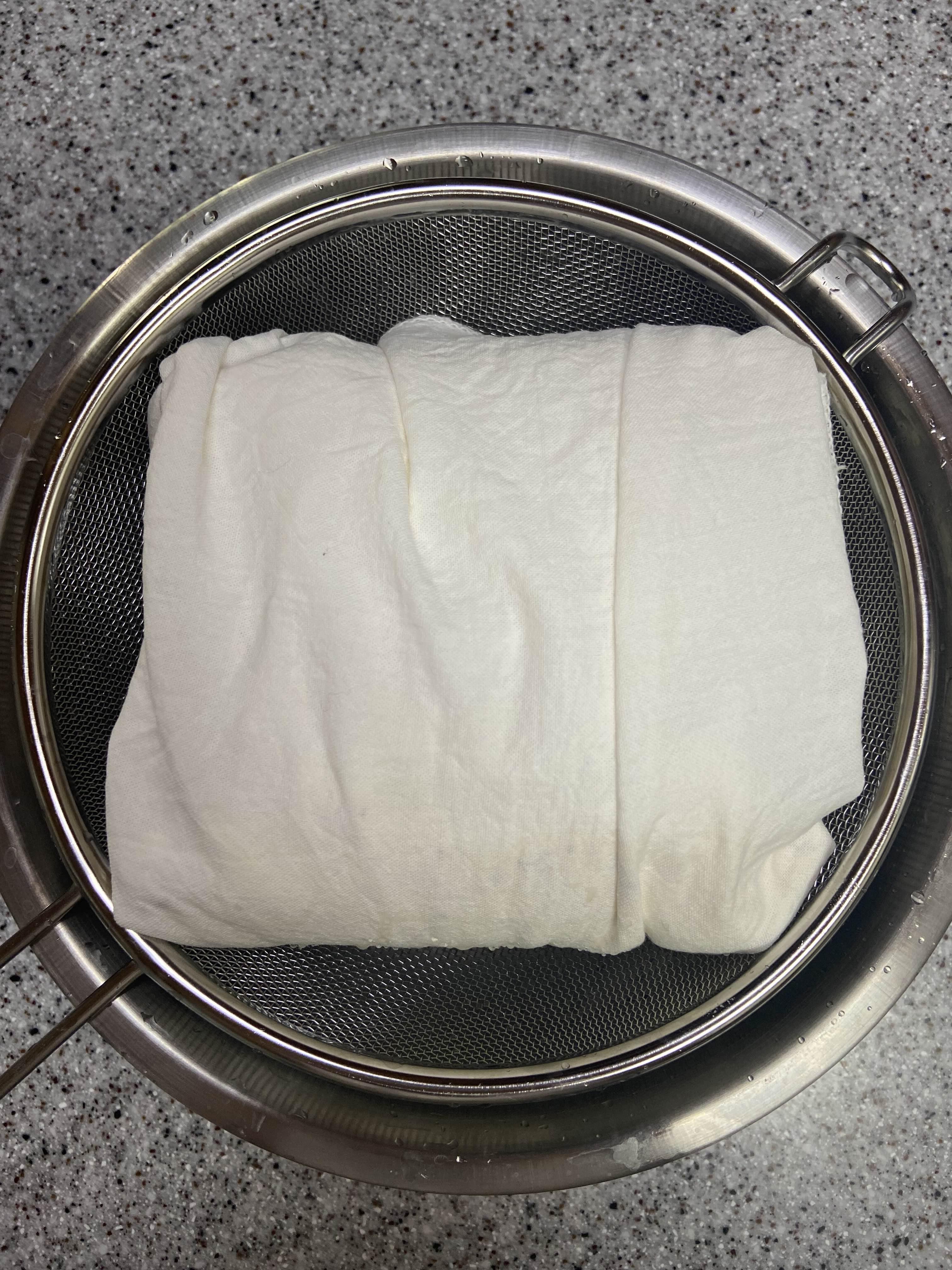 2. 면보를 사각접기를 한다. 유청이 잘 빠질 수 있게 팽팽하게 당겨서 접어주어야 한다. 그릭요거트가 만들어지는 중간에 한두번 정도 면보를 펼쳐서 모아서 다시 팽팽하게 접어준다. 유청이 빠지면서 용량이 줄어들기 때문에 요거트를 다시 가운데로 모아서 접어주는 게 필요하다.