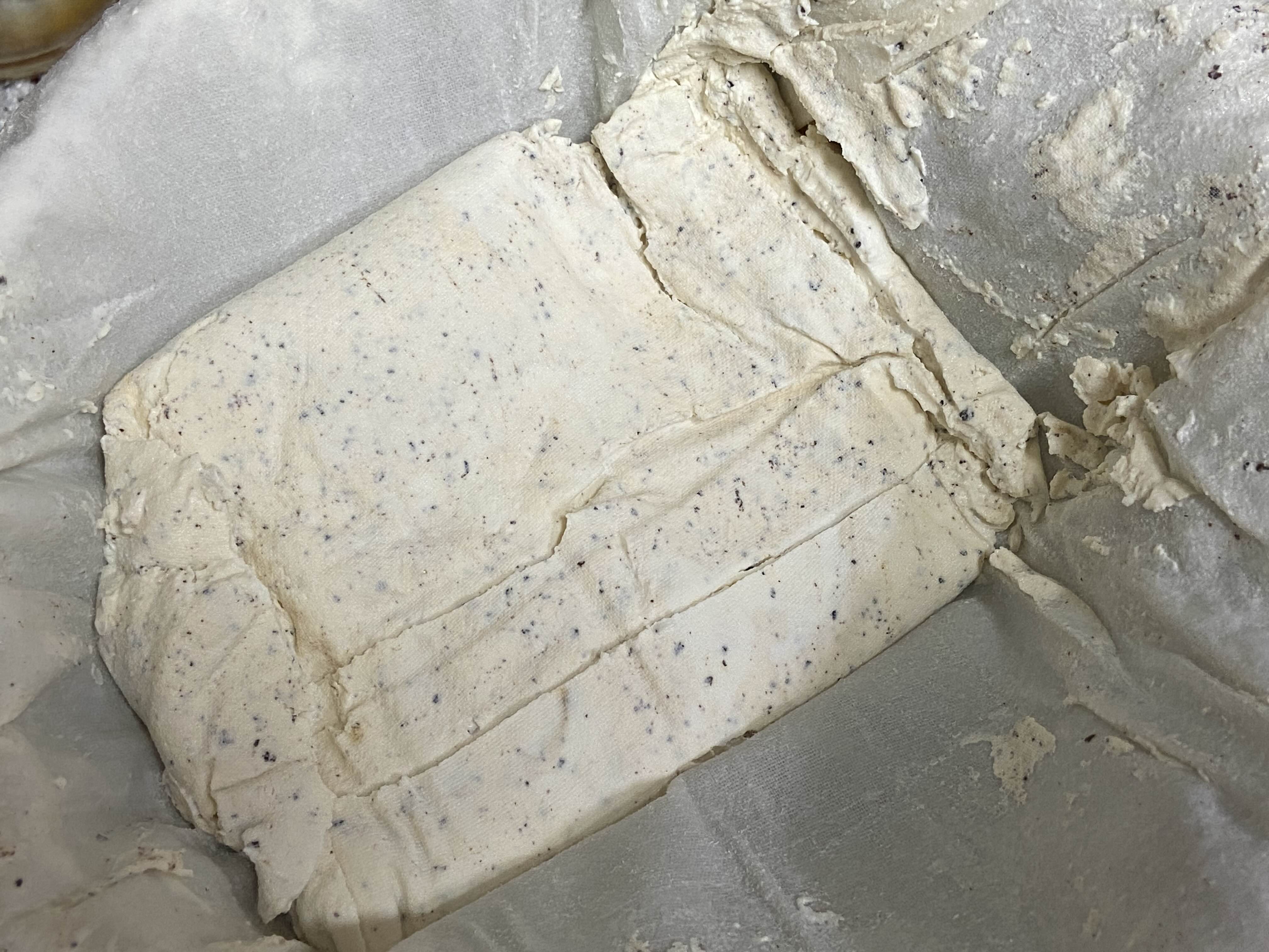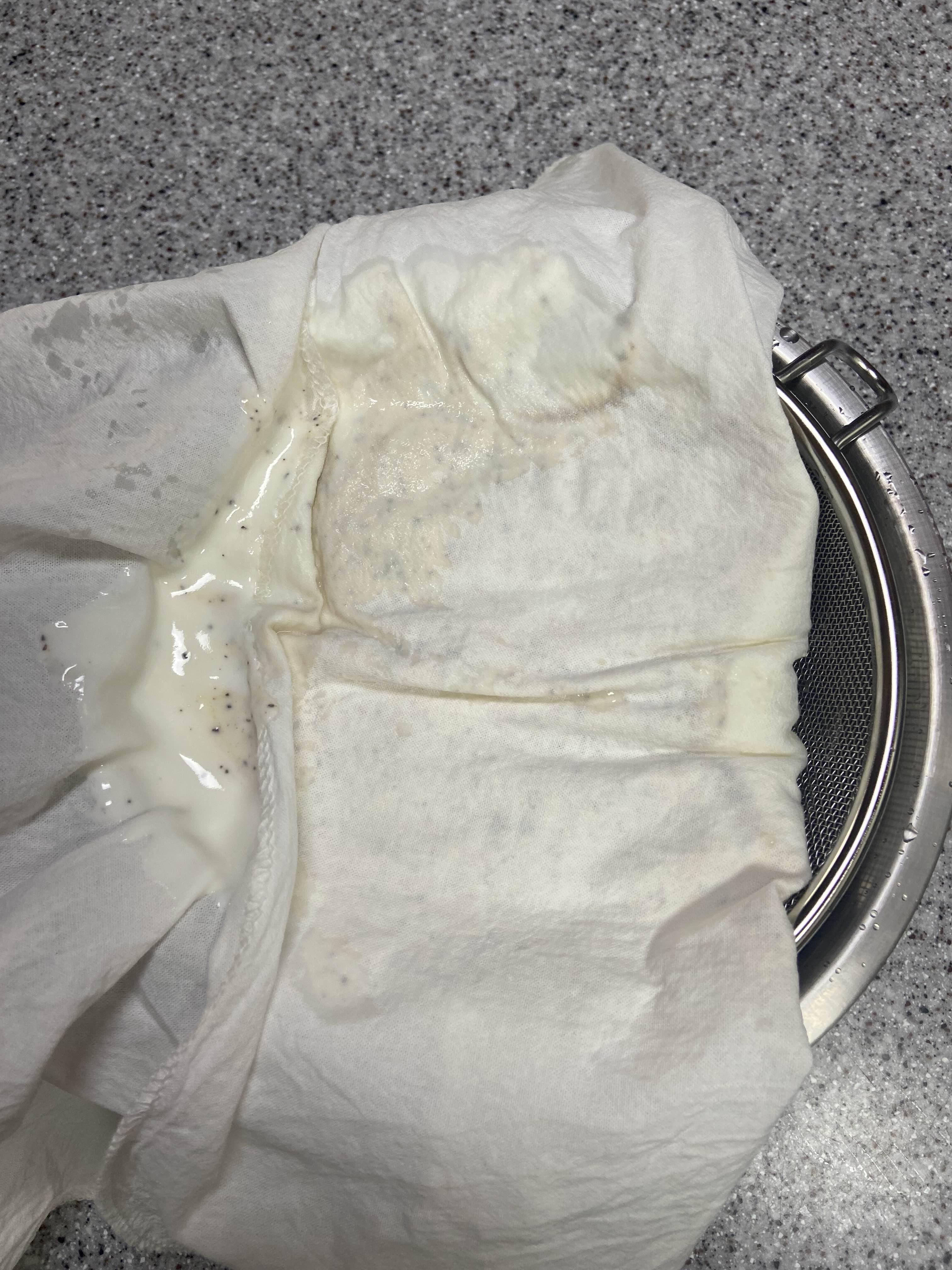 4. 한두번 펼쳤다 다시 접어서 눌러주는 것을 반복하고 시간이 지나면 이렇게 꾸덕한 그릭요거트가 만들어진다! 면보 주면에 묻은 요거트들이 처음에는 난감하겠지만 유청 분리가 잘 되면 쉽게 떨어진다. 사먹는 그릭요거트보다 더 많은 양을 듬뿍 먹을 수 있는게 제일 큰 장점이다.