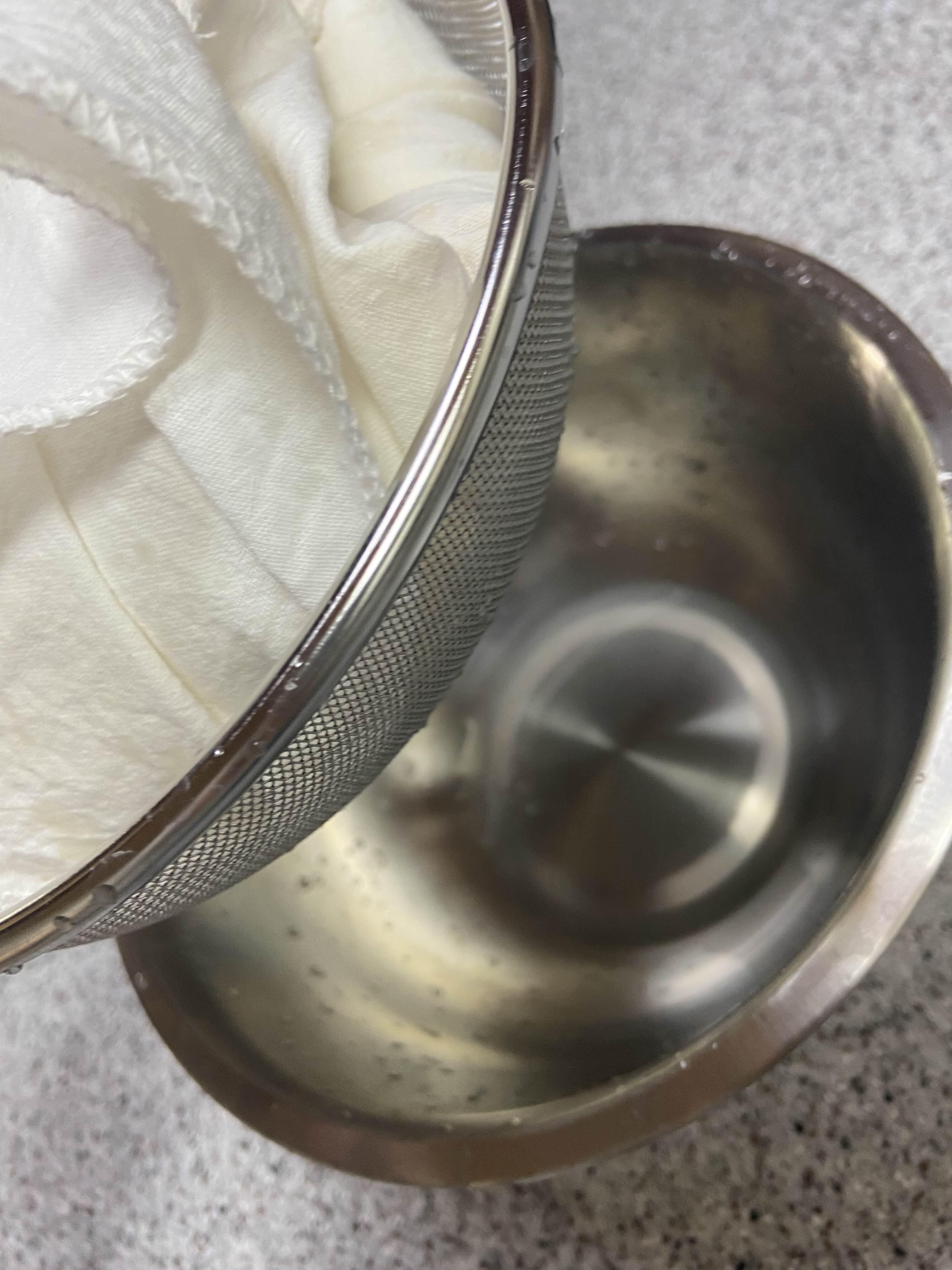 1. 맨 아래에 스텐그릇 -> 채반 -> 면보 순서로 세팅한다. 그리고 그 위에 만들어진 요거트를 부어준다.