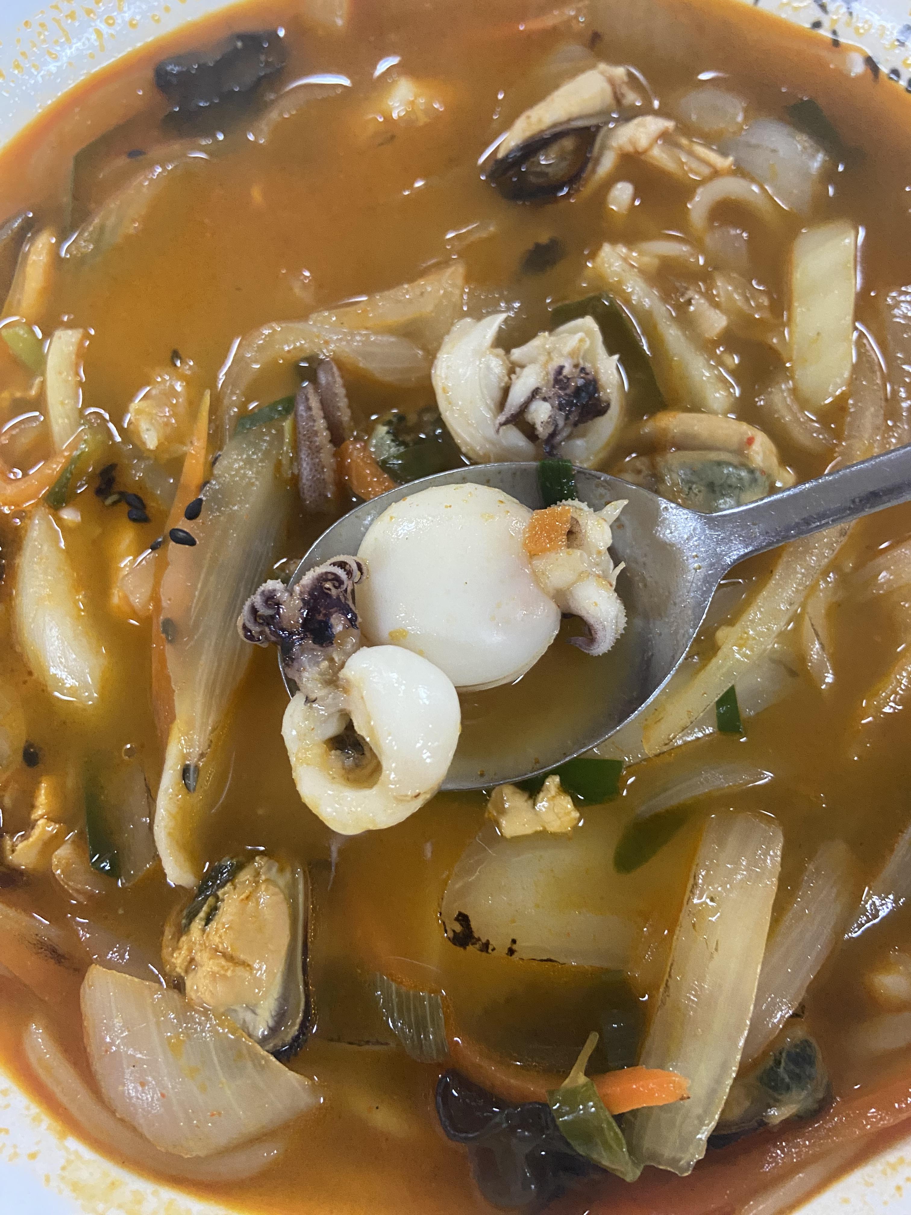 해물이 가득 들어있다. 다른 짬뽕집에 보지 못했던 저 쭈꾸미 같은 것도 들어있는데 부드럽고 맛있었다. 난 해산물이 좀 질기거나 딱딱한 건 싫어하는데 여기는 식감은 살아있으면서 부드러워서 거를 해산물이 없었다.
