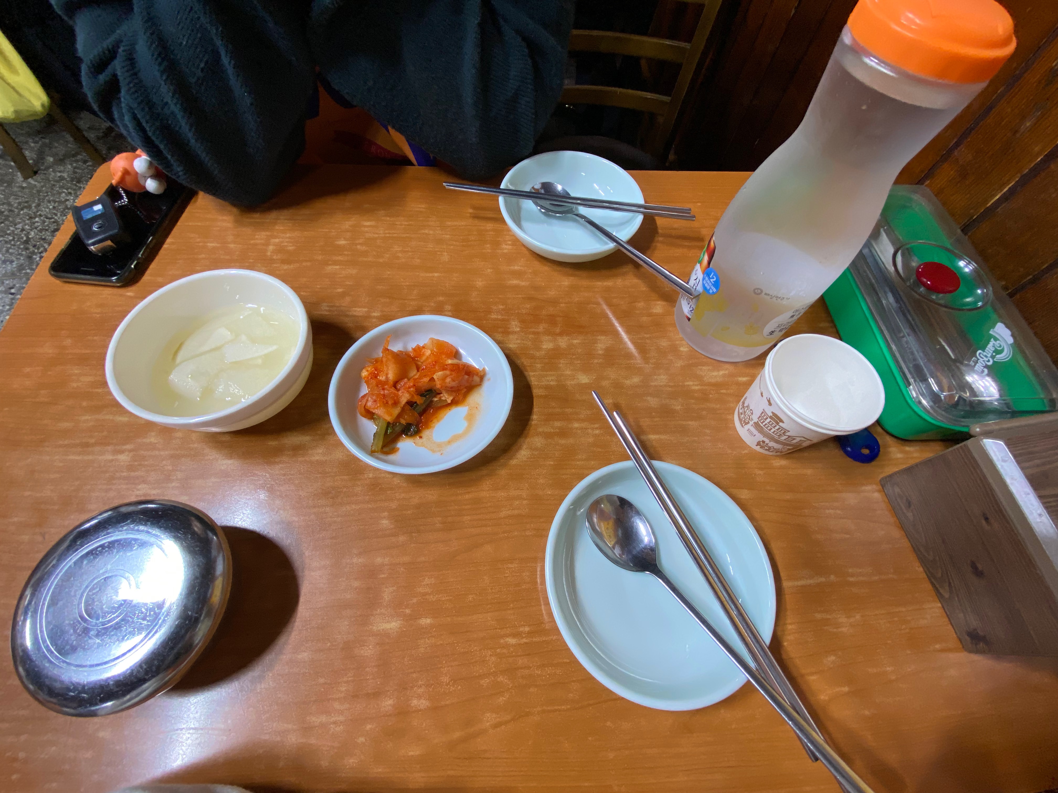 자리에 앉자마자 세팅되는 기본상. 손님이 많아서 정말 빠르다..ㅎ 가게가 잘 돼서 손님도 많아졌지만 원래 방식대로 주문받고 서빙해주고 공간도 그대로 유지하고 있는 점이 좋았다. 석박지 김치와 엄청 달달한 동치미(?)가 기본 반찬이다.