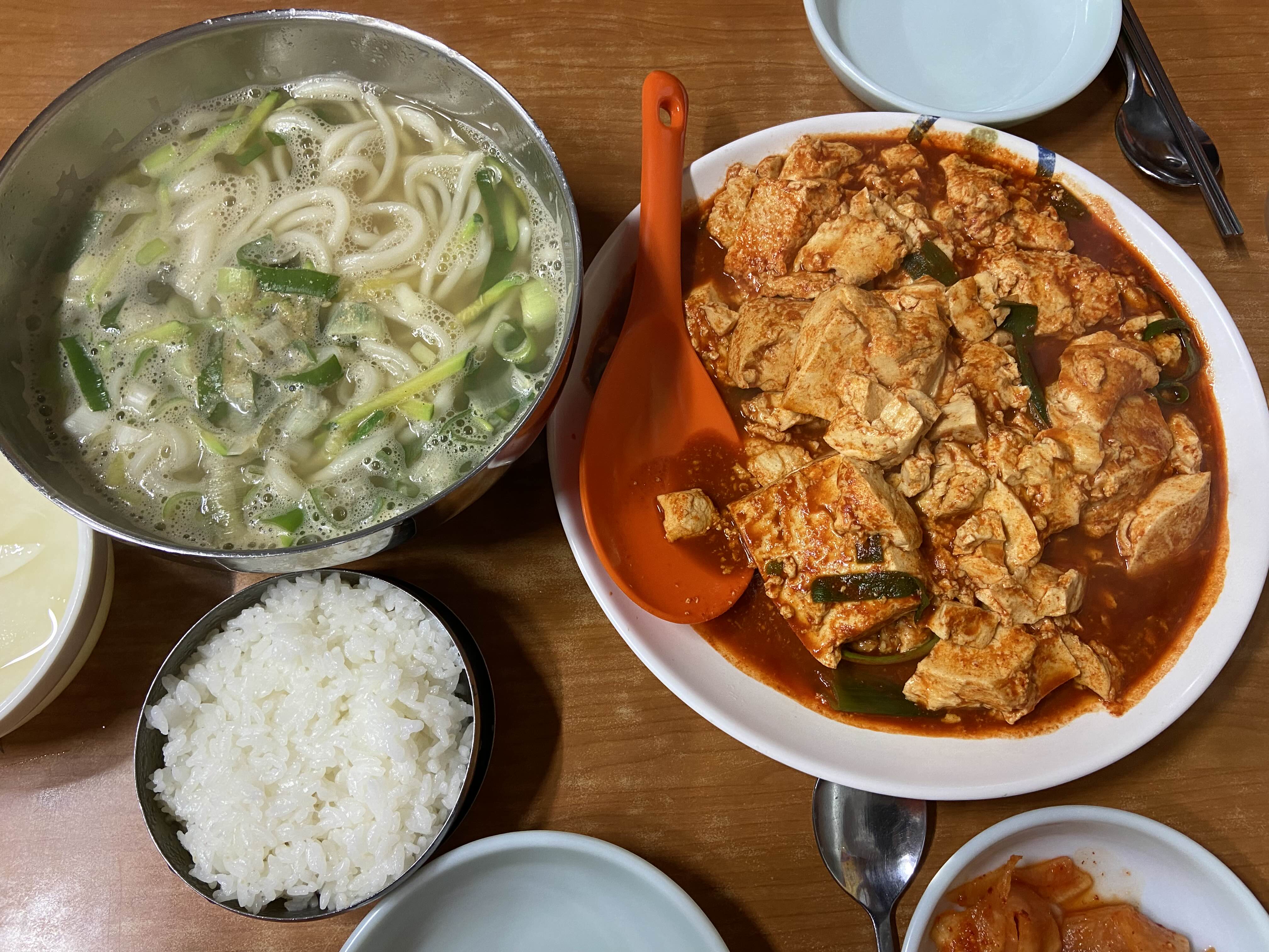우리가 시킨 건, 두부두루치기 소짜 중간 매운맛 , 칼국수, 공기밥. 전도 먹고 싶었지만 배부를 것 같아서 참았다.