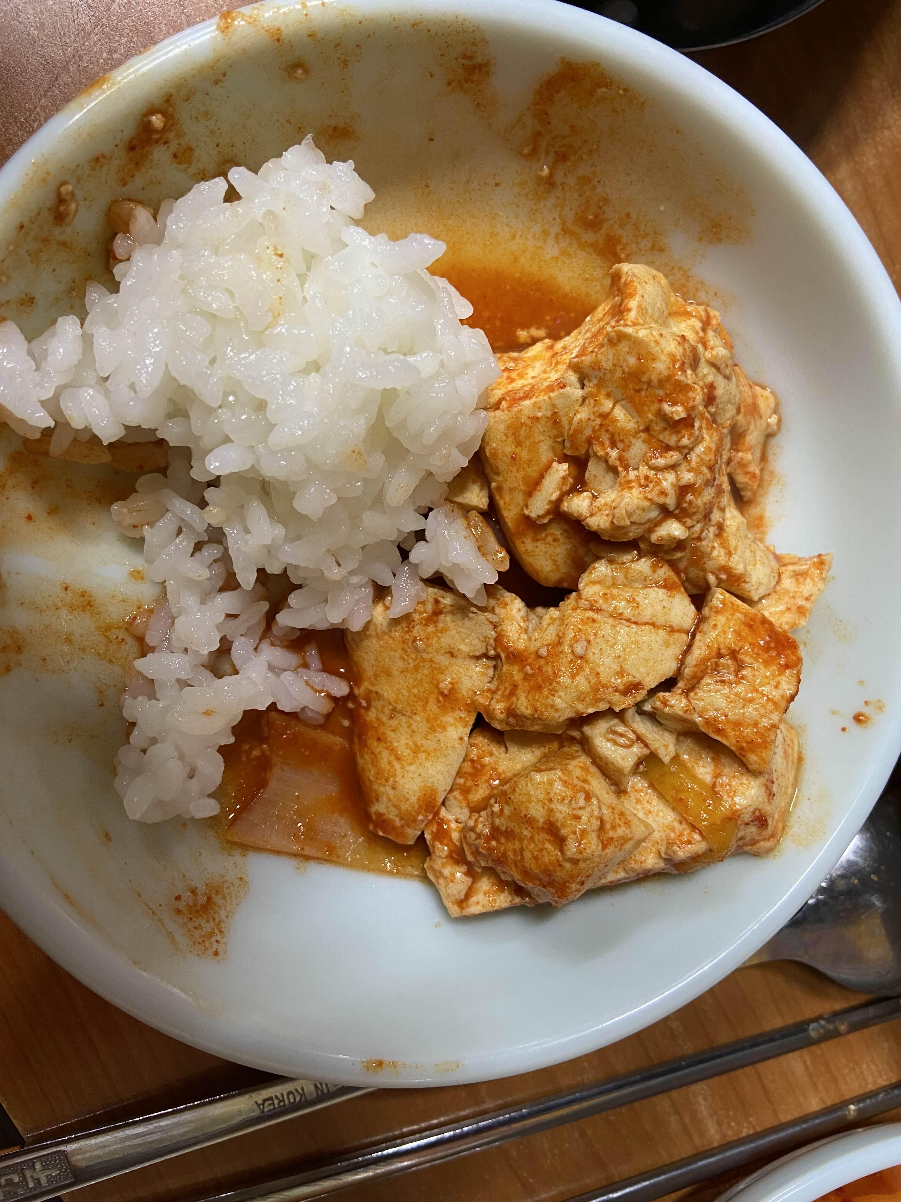 나는 그래도 밥에 두부랑 소스 잔뜩해서 비벼 먹는게 더 맛있었다. 소스가 진짜 맛있다. 아는 맛인데 새로운 맛이랄까? 간장맛이 많이 나는 소스였다. 게다가 두부도 진짜 맛있다…! 두부가 고소하고 짱 맛있어서.. 두부전을 추가로 더 시키고 싶을 정도였다.