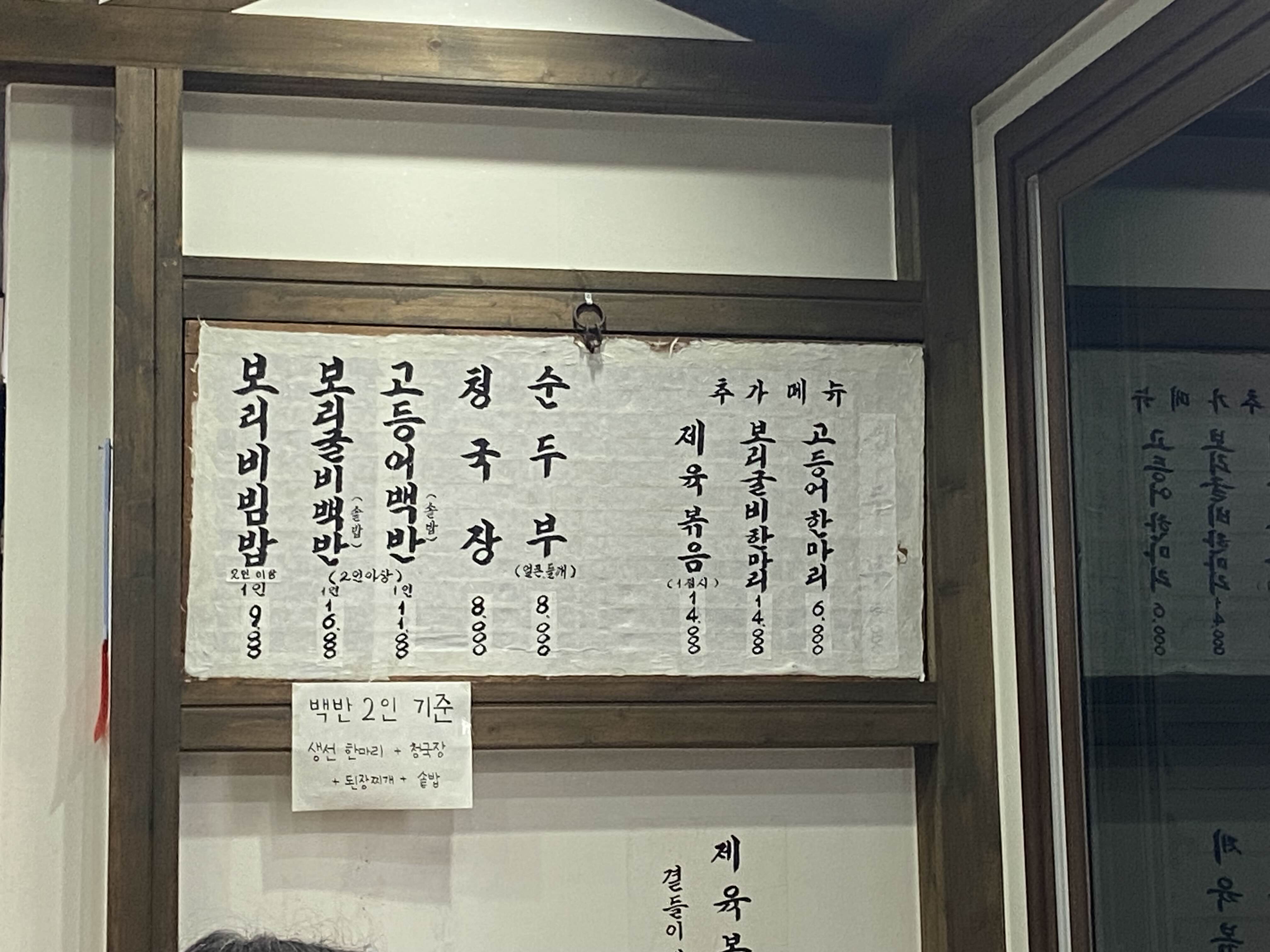 메뉴는 이렇다. 백반을 먹으면 솥밥이 나와서 좋지만 순두부찌개가 먹고 싶다면 개별 메뉴로 시키고 추가 메뉴에서 고등어 한마리나 다른 메뉴를 시키는 방법이 있다.