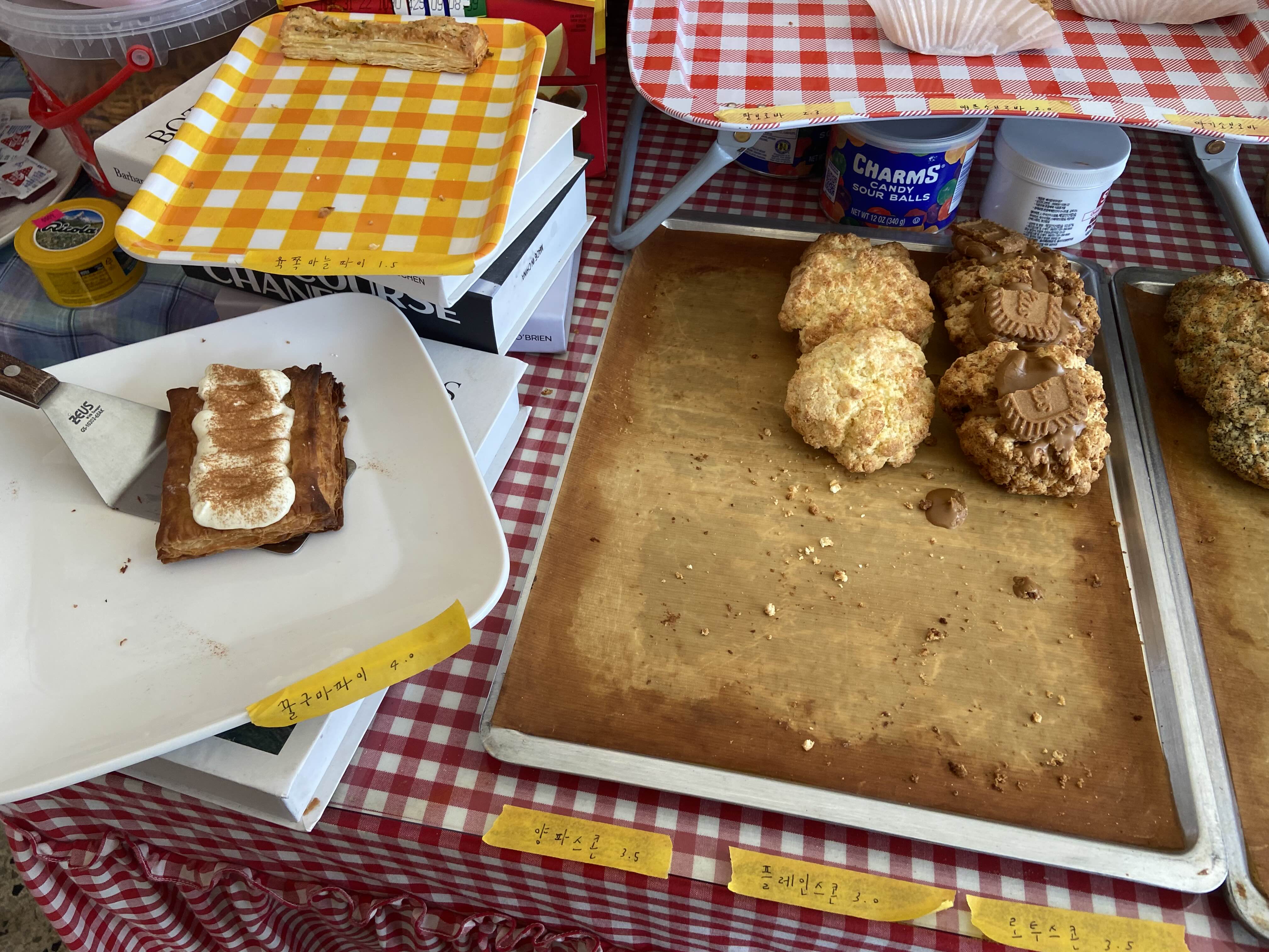들어가자마자 눈길을 사로잡는 건 달달한 디저트들이다. 벌써 많이 팔려서 빈 곳도 보인다. 일단 이곳에서 볼 수 있는 구움 과자류의 디저트들이 흔하게 볼 수 있는 종류들이 아니었다.