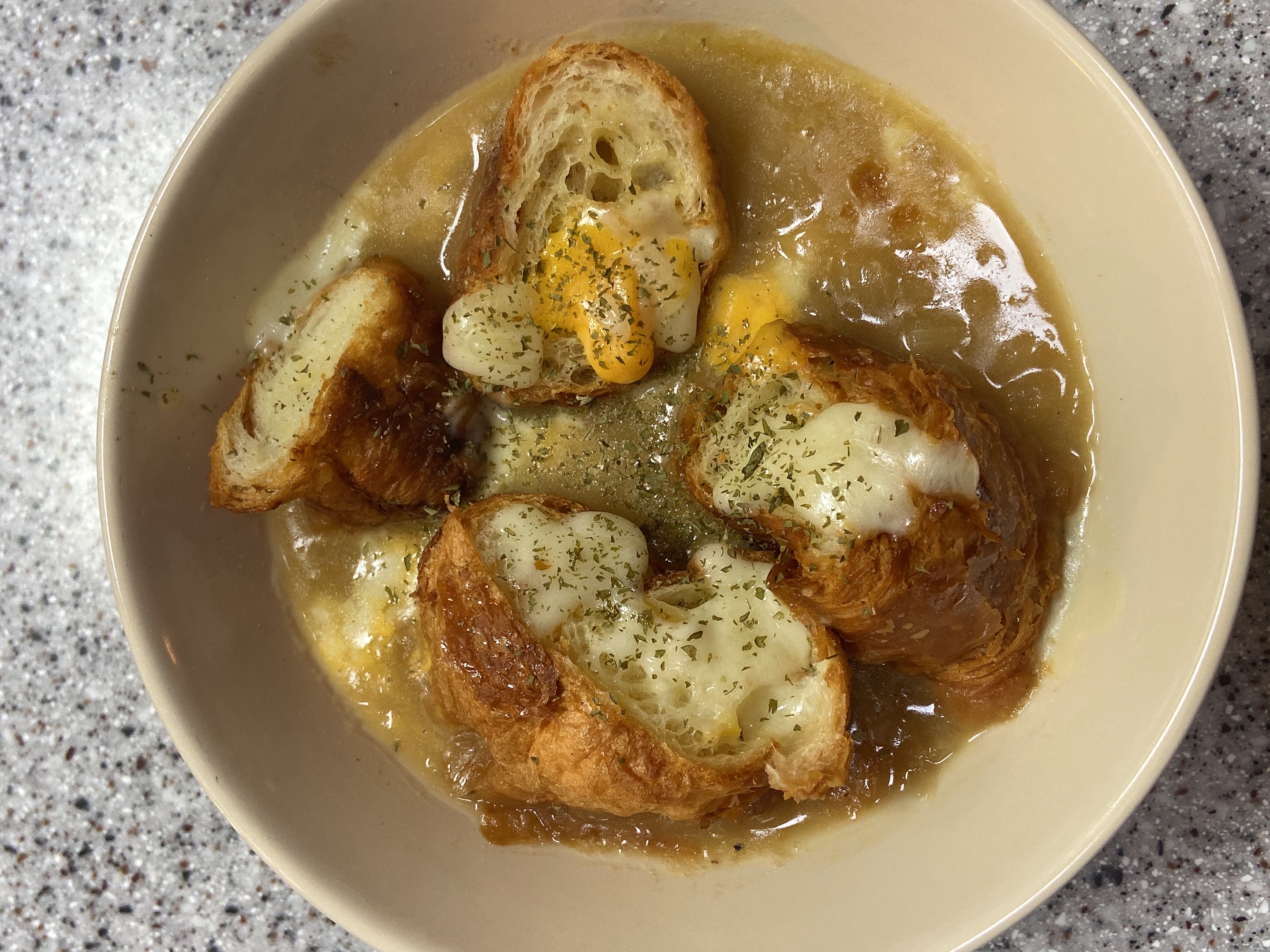6. 꼭 빵과 치즈를 올려주어야 맛있는 한끼가 된다. 빵은 크루통을 만들기도 하고 바게트를 구워서 올리기도 하지만… 나는 그냥 맛있는 크로와상을 올렸다. 굳이 구워주지도 않았다. 어짜피 스프에 들어갈텐데 모.. 그런데 크로와상이 버터도 많이 들어있고 기냥 먹어도 맛있는 빵이라서 양파스프를 더 맛있게 해주었다.