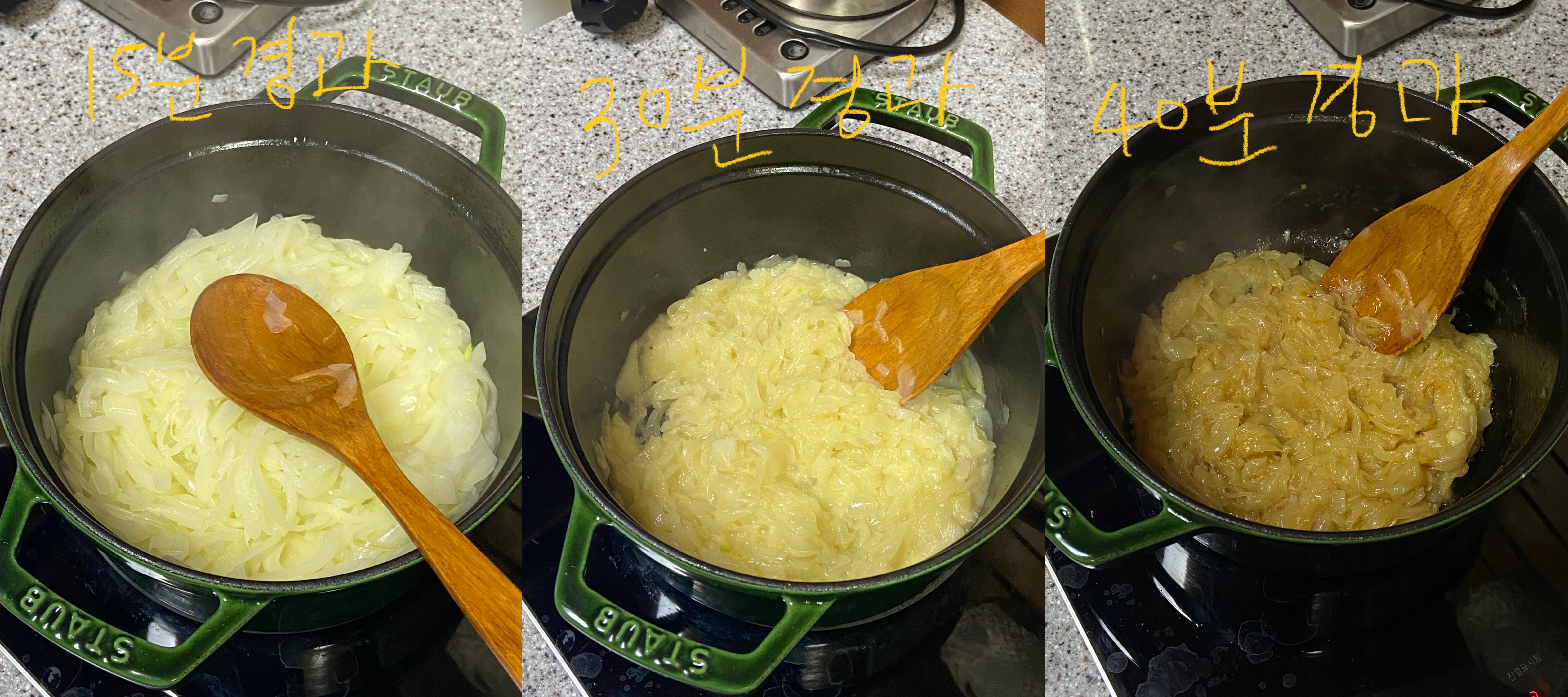 2. 양파의 카라멜라이징이 제일 중요하고 오래 걸리는 작업이다. 밑에 눌러붙지 않게 휘휘 저어주면서 지켜보고 있으면 허리가 아파올 때 양파의 색이 변하기 시작한다. 이때 양파가 타지 않고 갈색빛이 나도록 해야 한다. 나는 40분 정도 걸렸다. 정말 오래걸리니 처음부터 마음 먹고 재밌는 동영상을 시청하며 요리하시라.
