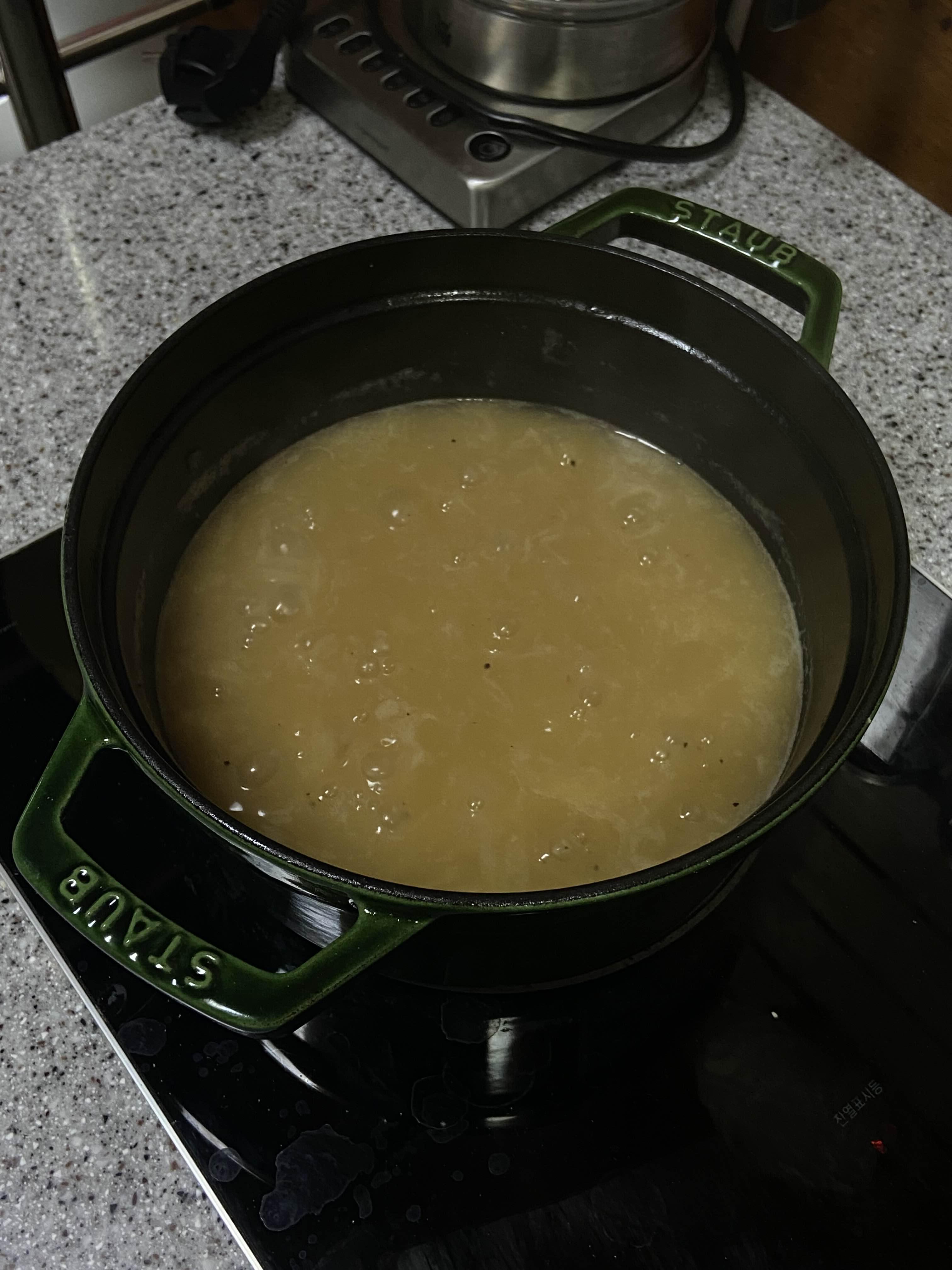 2. 양파의 카라멜라이징이 제일 중요하고 오래 걸리는 작업이다. 밑에 눌러붙지 않게 휘휘 저어주면서 지켜보고 있으면 허리가 아파올 때 양파의 색이 변하기 시작한다. 이때 양파가 타지 않고 갈색빛이 나도록 해야 한다. 나는 40분 정도 걸렸다. 정말 오래걸리니 처음부터 마음 먹고 재밌는 동영상을 시청하며 요리하시라.