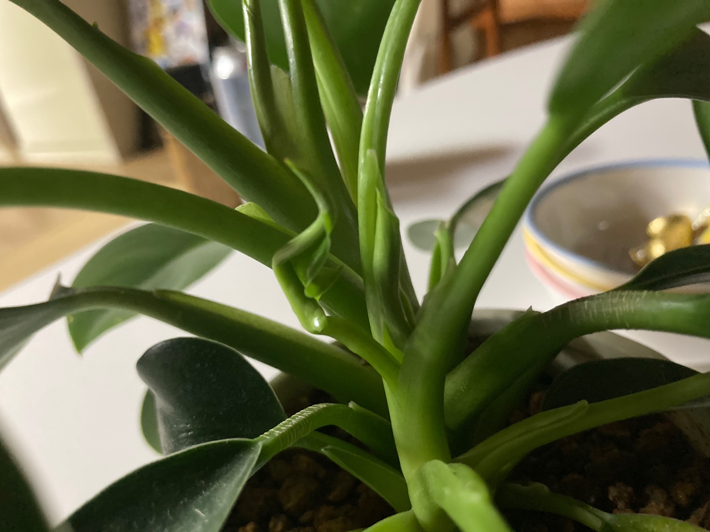 그리고 시간이 지나도 여전히 빠지지 못하고 저 모양새로 그대로 있었다. 이 정도면 식물도 힘들 것 같아서 새 잎이 끼어있는 줄기를 옆으로 밀어주니 끼어있는 잎이 쉽게 쑥 빠졌다!