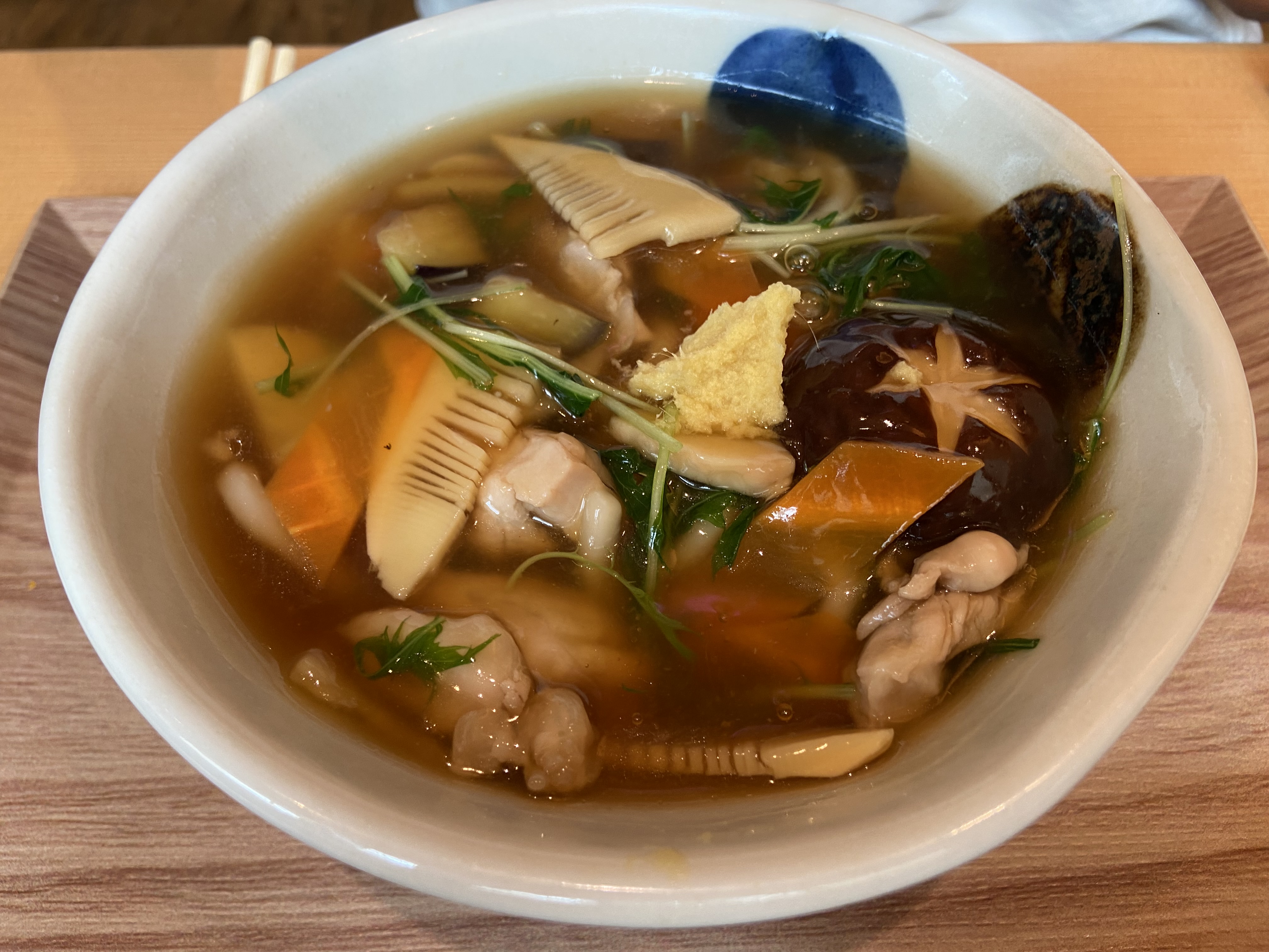 닭육수 우동은 저 국물이 전분물을 푼 것처럼 녹진하다. 그리고 저 위에 생강 다진게 있는데 조금 덜어내는 것을 추천한다.(애기 입맛) 이 우동이 이곳의 시그니처같은 느낌이었는데 국물을 한 숟가락 먹으니 뜨끈하면서 속을 풀어주는 게 진국이었다. 많은 야채들이 들어있는데 뜨끈한 국물에 푹 익혀져서 맛있었고 가지가 짱이다...! 여름이어도 저 우동은 꼭 시키자.