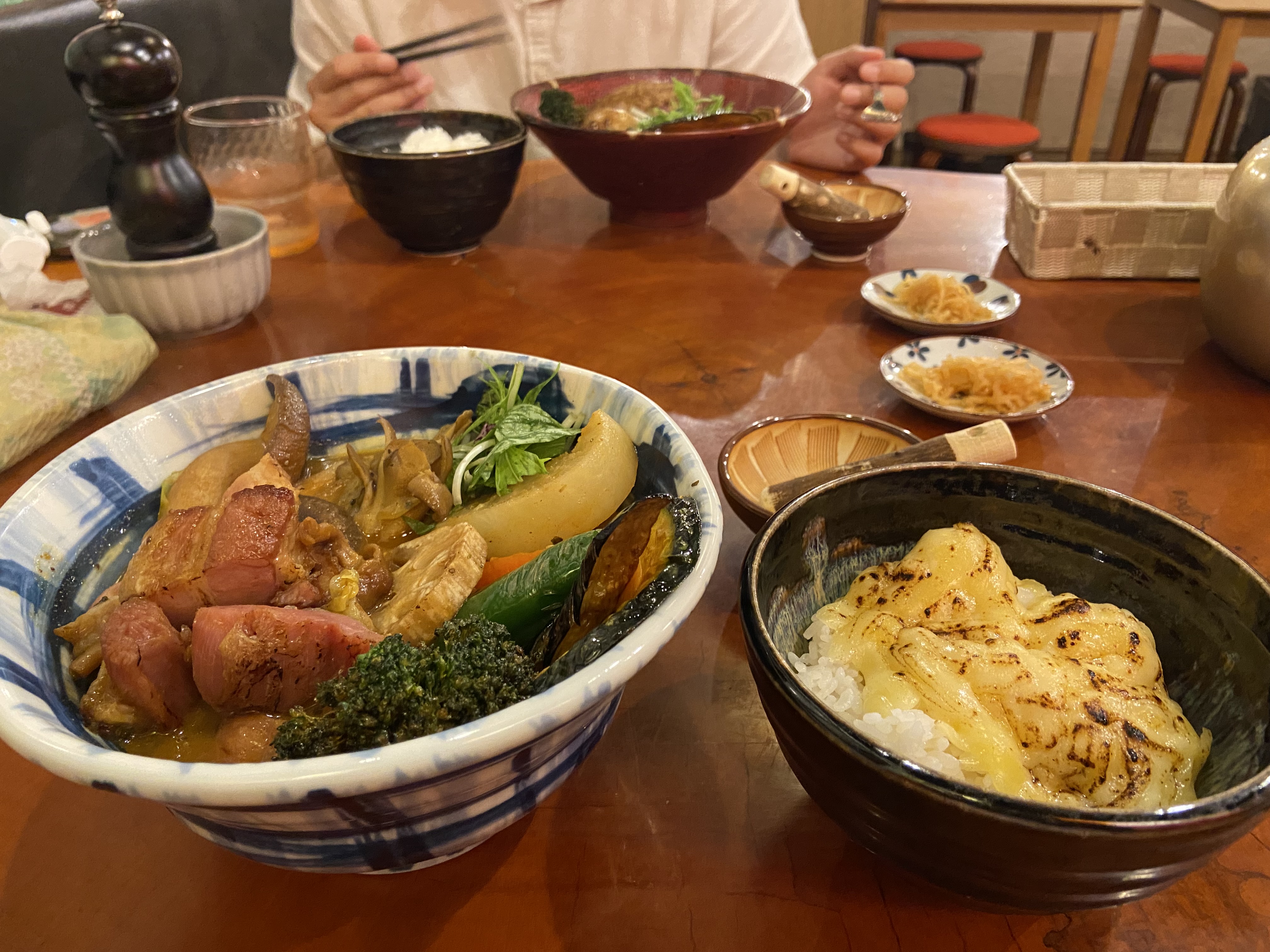 내가 시킨건 스모크 베이컨 버섯 스프 카레, 배우자가 시킨 건 함바그 구운 야채 스프카레이다. 건새우를 주시는데 이걸 갈아서 넣어 먹으면 해물향이 살짝 난다. 치즈를 카레에 올리지 못해 아쉽지만 밥에 올라간 것도 맛있었다. 그리고 여러 종류의 구운 야채들이 들어가 있어서 먹는 재미가 있다. 튀긴 브로콜리에서 기름이 쭉 나와서 맛있고 단호박도 정말 꿀맛이다.