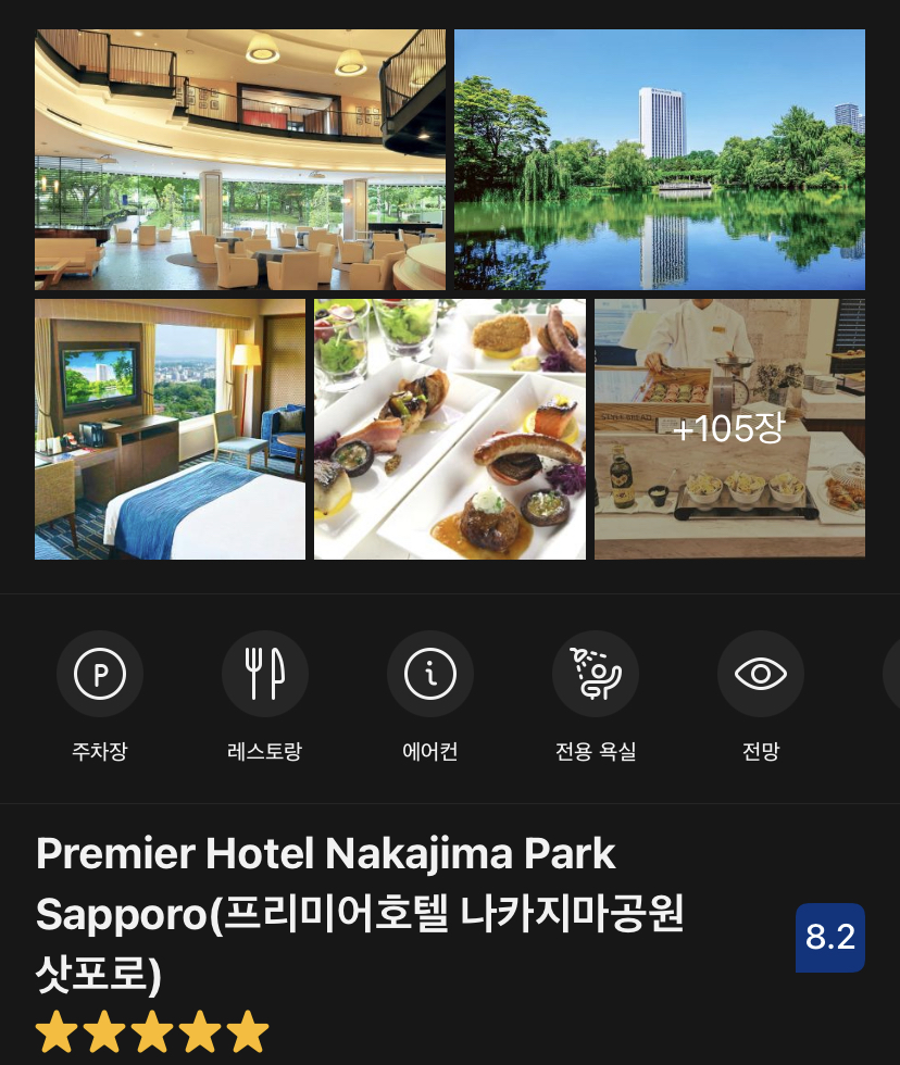 프리미어호텔 나카지마 공원 삿포로이다. 나카지마 공원에 위치해 있는데 숙박을 하지 않으면 굳이 오지 않을 공원이라서 추천한다. 호텔의 어떠함 보다 호텔이 위치한 곳이 매력적이다.