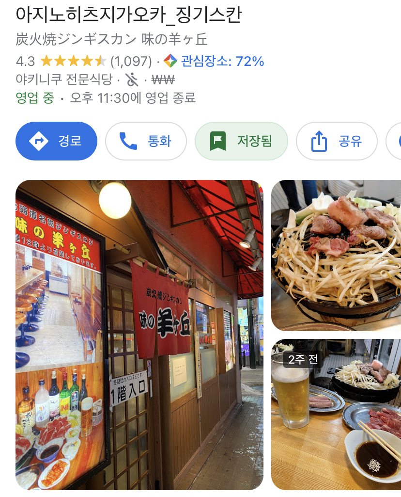 저기 호르몬 야키니쿠 리키오는 레몬사와를 본격적으로 하는 이자카야라서 정말 가고 싶었는데 못 갔다. 내장 부위와 우설을 구워먹는 곳이다. 그리고 징기스칸을 가려면 아지노하츠지가오카 여기가 맛도 괜찮은데 웨이팅이 없다고 한다.