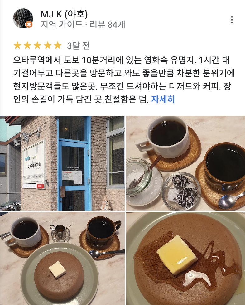 여기 카페 너무 가보고 싶었는데...! 휴무일에 겹쳐서 못 갔다. 만화에서 보던 두툼하고 매끈한 팬케이크에 버터 한덩이가 올라가 있는 사진 보고 여긴 가야돼! 했는데