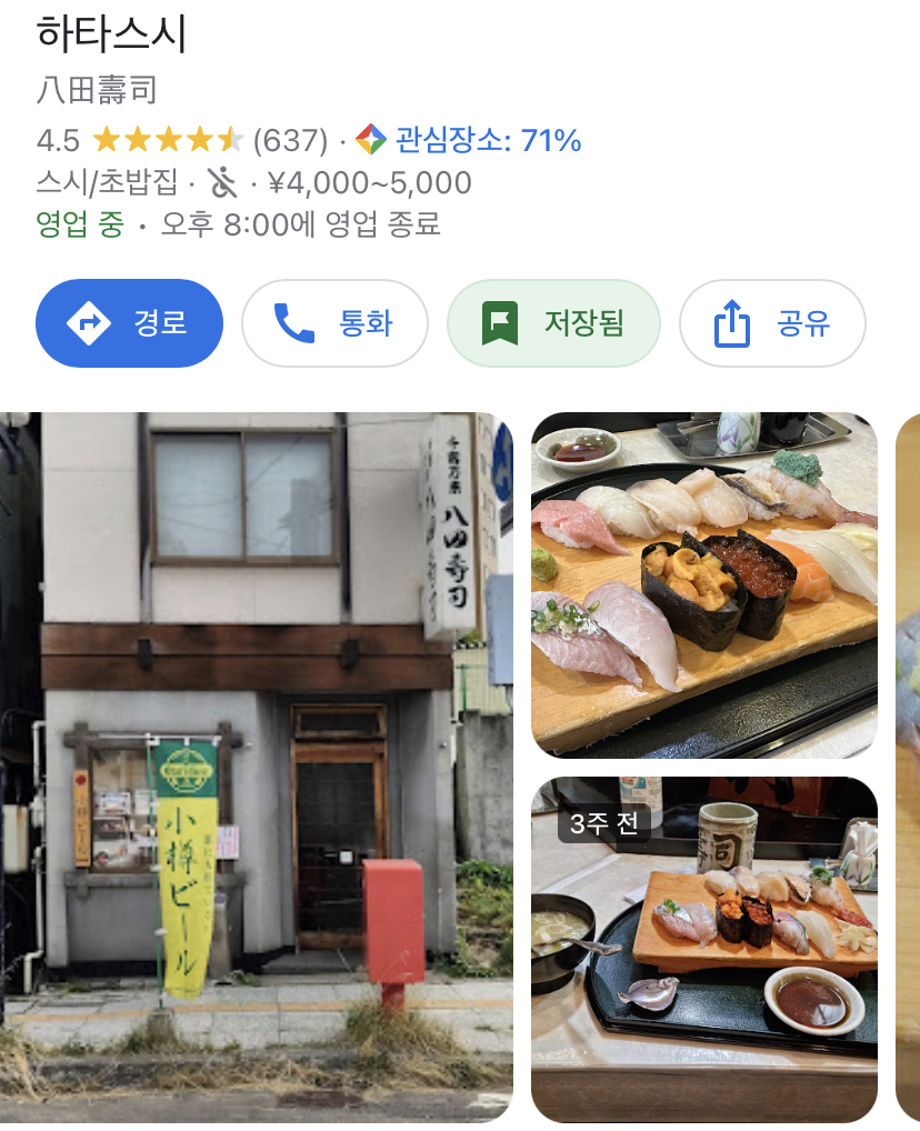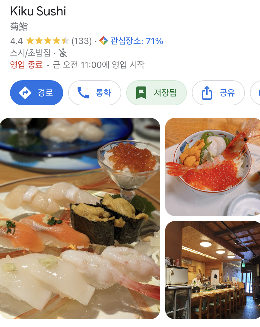 그래서 찾은 곳이 우오마사이다. 구글에서 열심히 서칭해서 찾았는데 마침 숙소 팜플렛에 적힌 맛집 리스트에도 적혀있는 스시집이었다. 영업도 오후 8:15분까지 해서 여유롭게 저녁식사를 즐길 수 있었다.