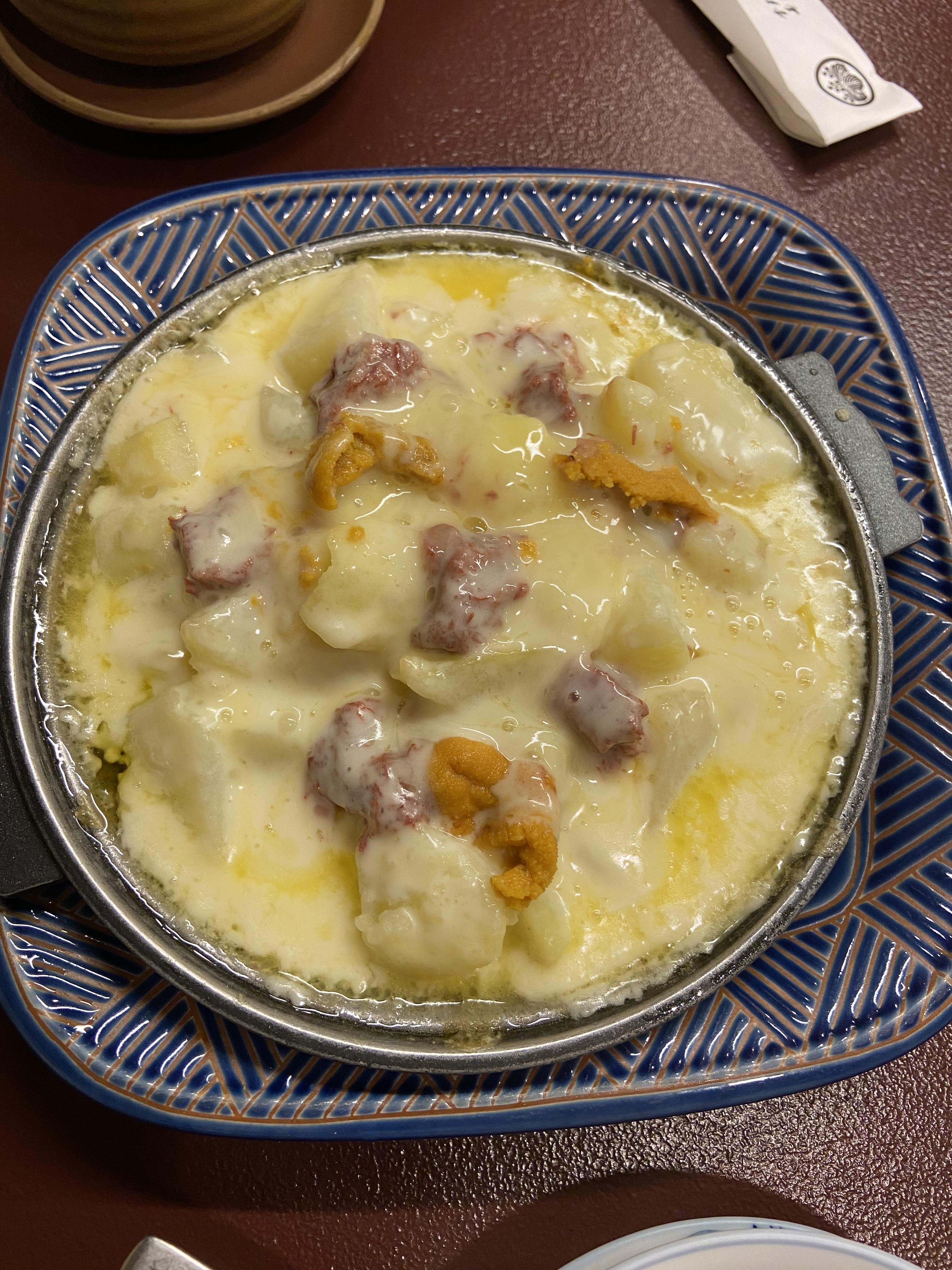 그리고 사이드로 시킨 치즈 감자는 해산물과의 조화가 완벽했다. 해산물에는 뜨거운 육지 음식이 필요하다. 감자가 유명한 홋카이도답게 포슬포슬하고 치즈가 정말 듬뿍이었다. 저게 사진으로 보는 것보다 크기가 훨씬 컸다. 사이드 보다는 메뉴 하나를 더 시킨 느낌! 심지어 위에 우니와 고기인지 참치인지 모를 고기가 올라가있었다. 메뉴판에서 찾지 못했기에 가격이 걱정되는 맛있는 맛이었다.