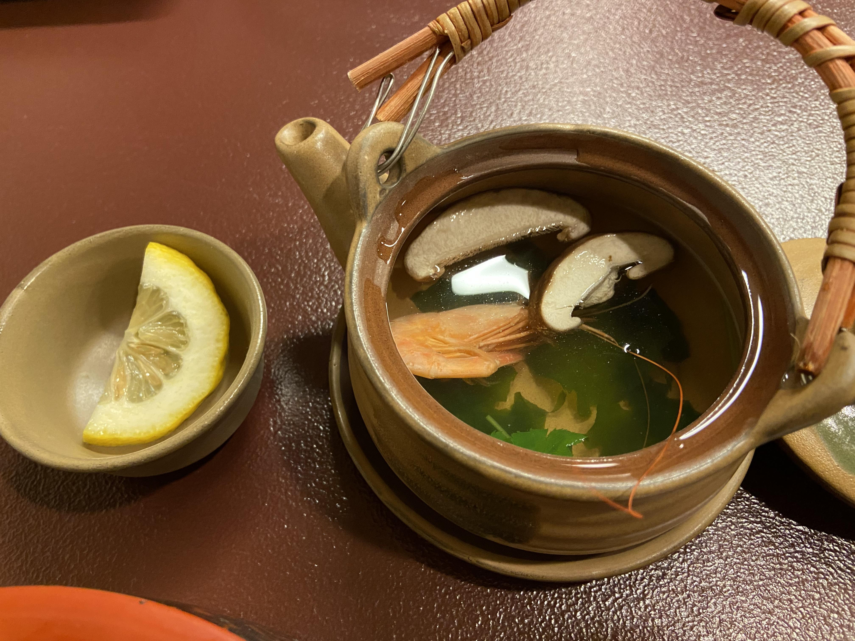 메인 메뉴를 시키면 저 주전자에 해물육수가 우러난 국물을 주신다. 주전자 예쁘게 담겨 나와 더 좋았고 진한 해물맛이 느껴졌다. 저 레몬은 용도를 모르겠다.