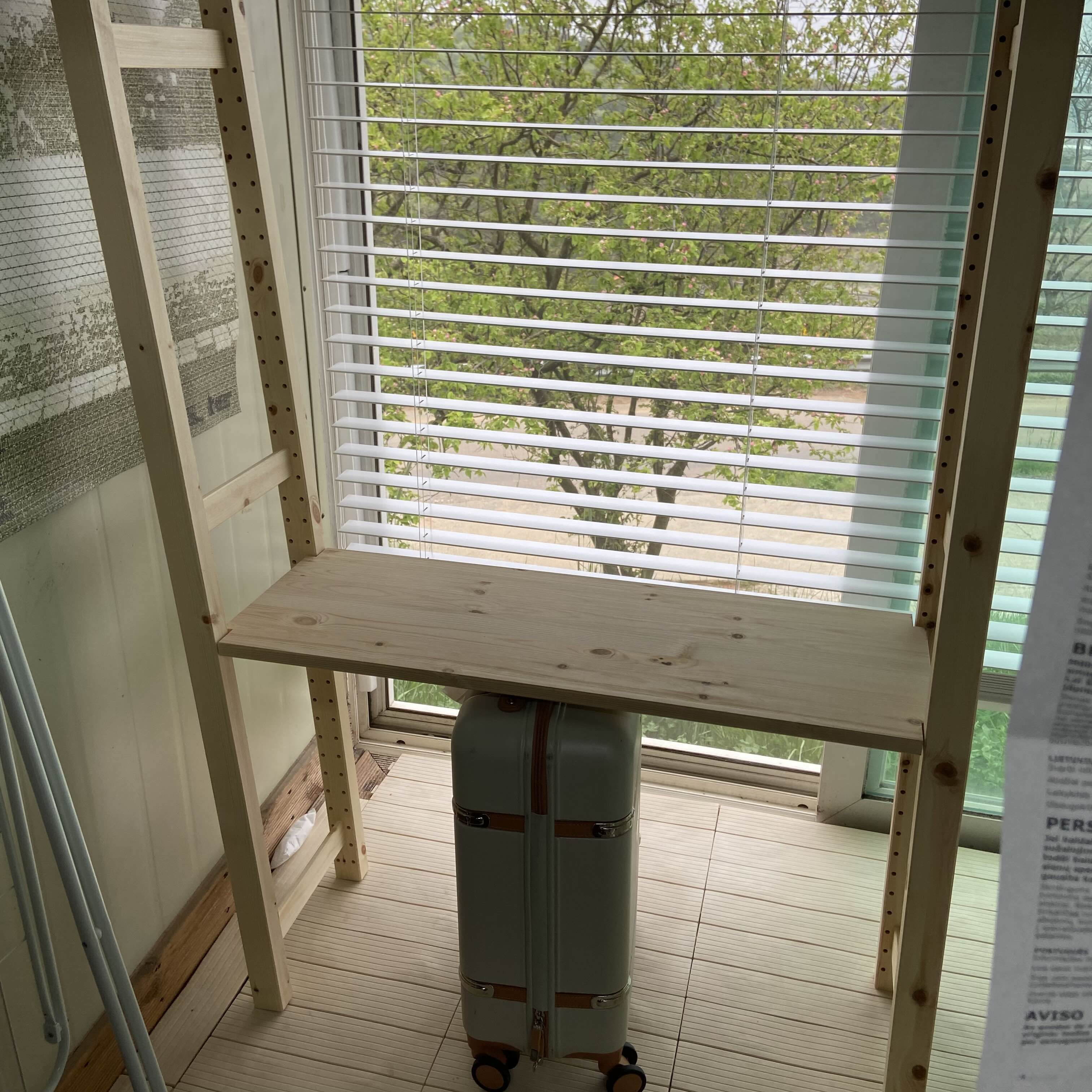 이 선반의 장점은 DIY라서 선반의 갯수를 원하는 만큼 구입하면 늘릴 수도 있고, 정말 좋은 건 선반의 높이도 조절할 수 있다는 것이다. 나는 밑부분은 트렁크와 휴지를 보관하기 위해 높게 했다. 그리고 맨 위 선반을 막혀있지 않게 조절해서 물건을 높게 올릴 수 있게 했다. 이렇게 조절할 수 있어서 물건을 많이 수납할 수 있다. 그리고 소나무 선반이라 그런지 나무냄새가 나는게 그게 또 향긋해서 좋다.