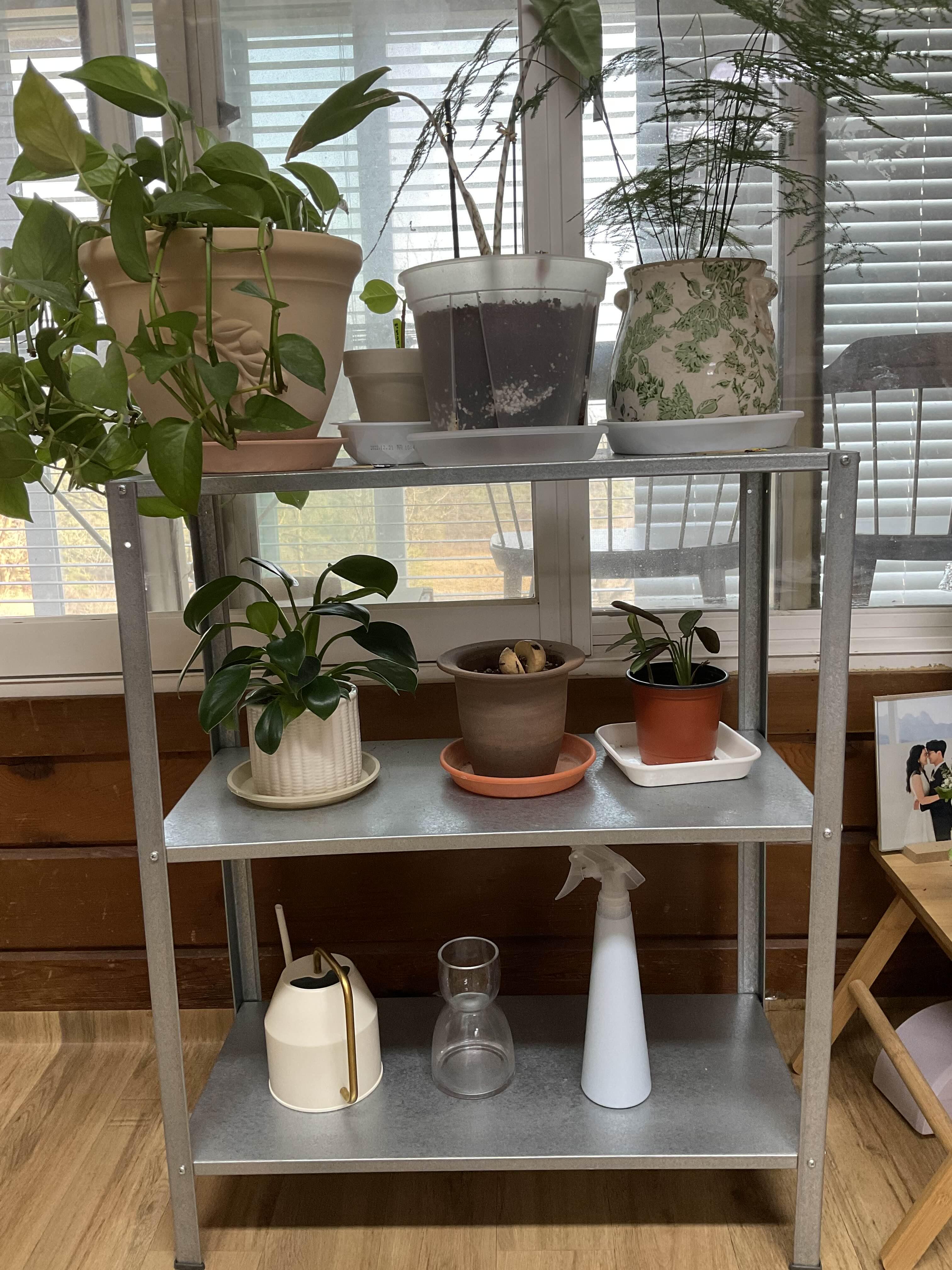이건 정말 개이득 가성비 선반이다. 내가 살 때는 세일까지 해서 19,000원에 샀다. 화분이 많아서 화분 놓을 용도로 구매했다. 원래 베란다에 뒀다가 겨울에 우리 식물들 추우니까 실내로 들였는데 실내에서도 괜찮게 어울러진다.