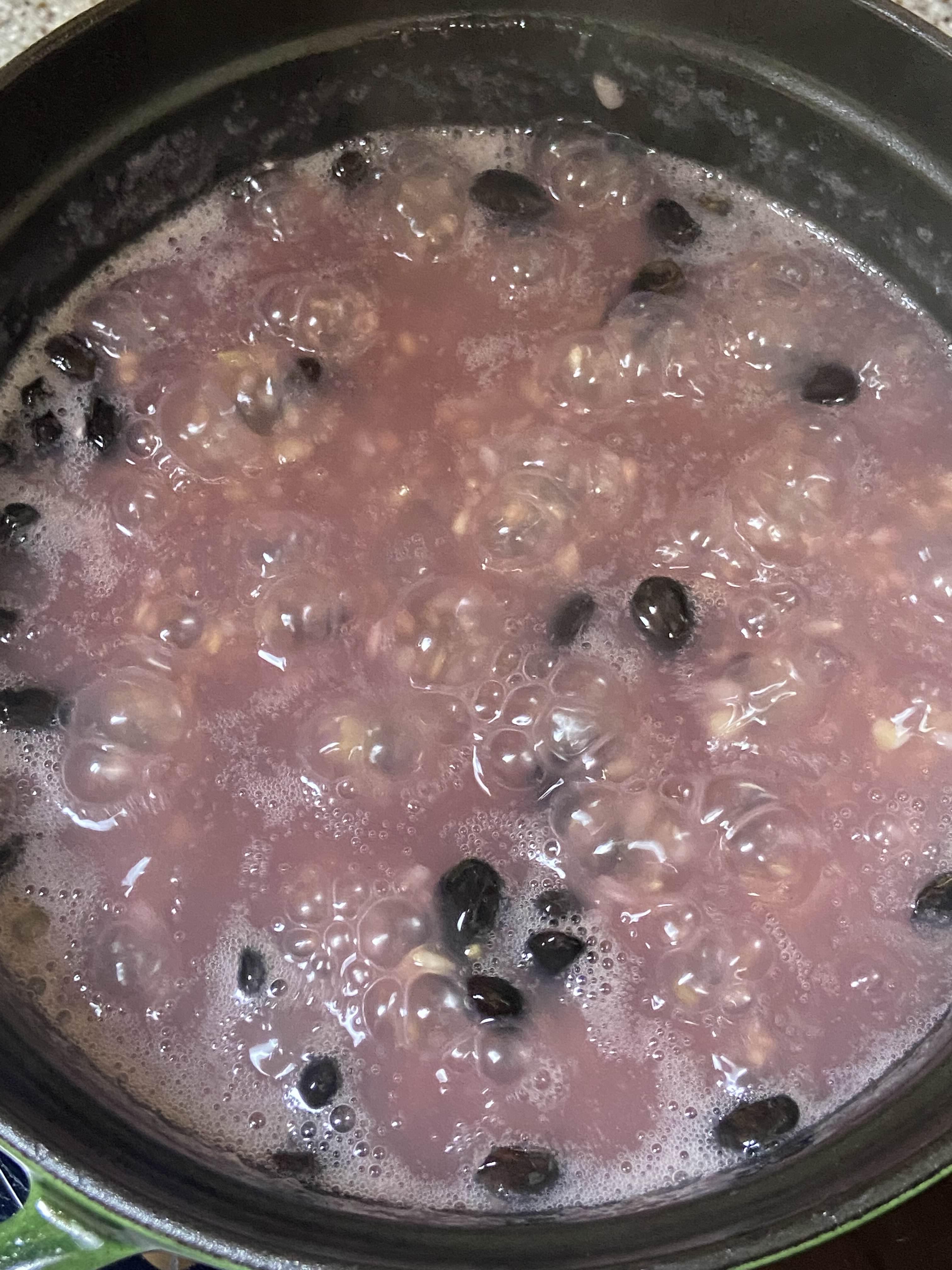 3. 냄비 뚜껑을 열고 강불에서 내용물이 바닥에 들러붙지 않게 섞어준다. 물이 끓어오르고 증발하면서 물이 자작해지고 쌀 사이로 끓는 물이 송송 구멍을 뚫으며 보글거리는 모습을 보인다. 이때가 중요하다.
