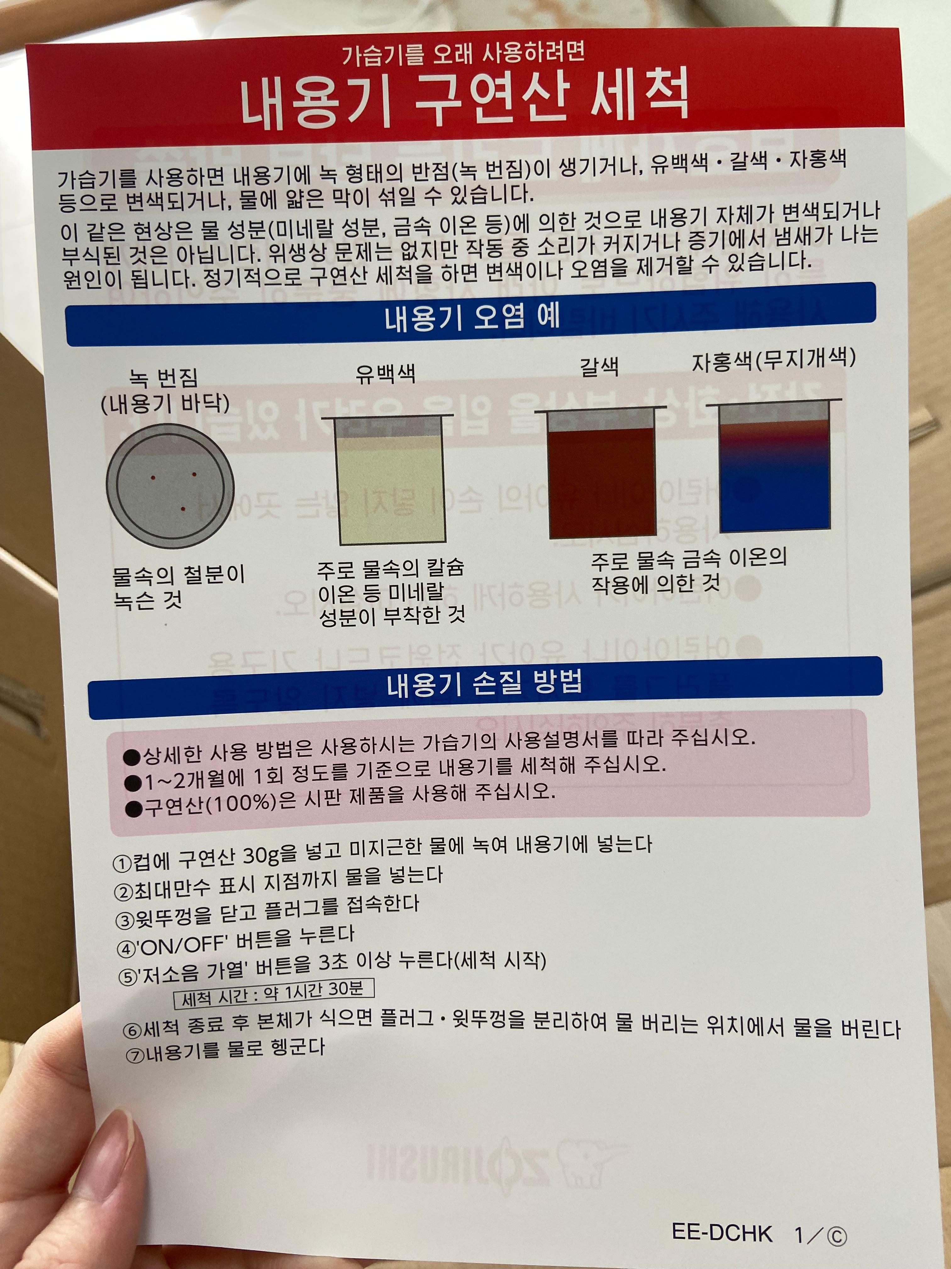 사용해보니 확실히 본체 아래에 딱딱하게 석회질(?) 같은 것들이 쌓이더라고요. 그런데 그게 지저분하다기보다는 이 불순물들을 다 거른 수증기만 내뿜는다고 생각이 들어서 오히려 가습기가 열심히 일하고 있다는 생각이 들어요~