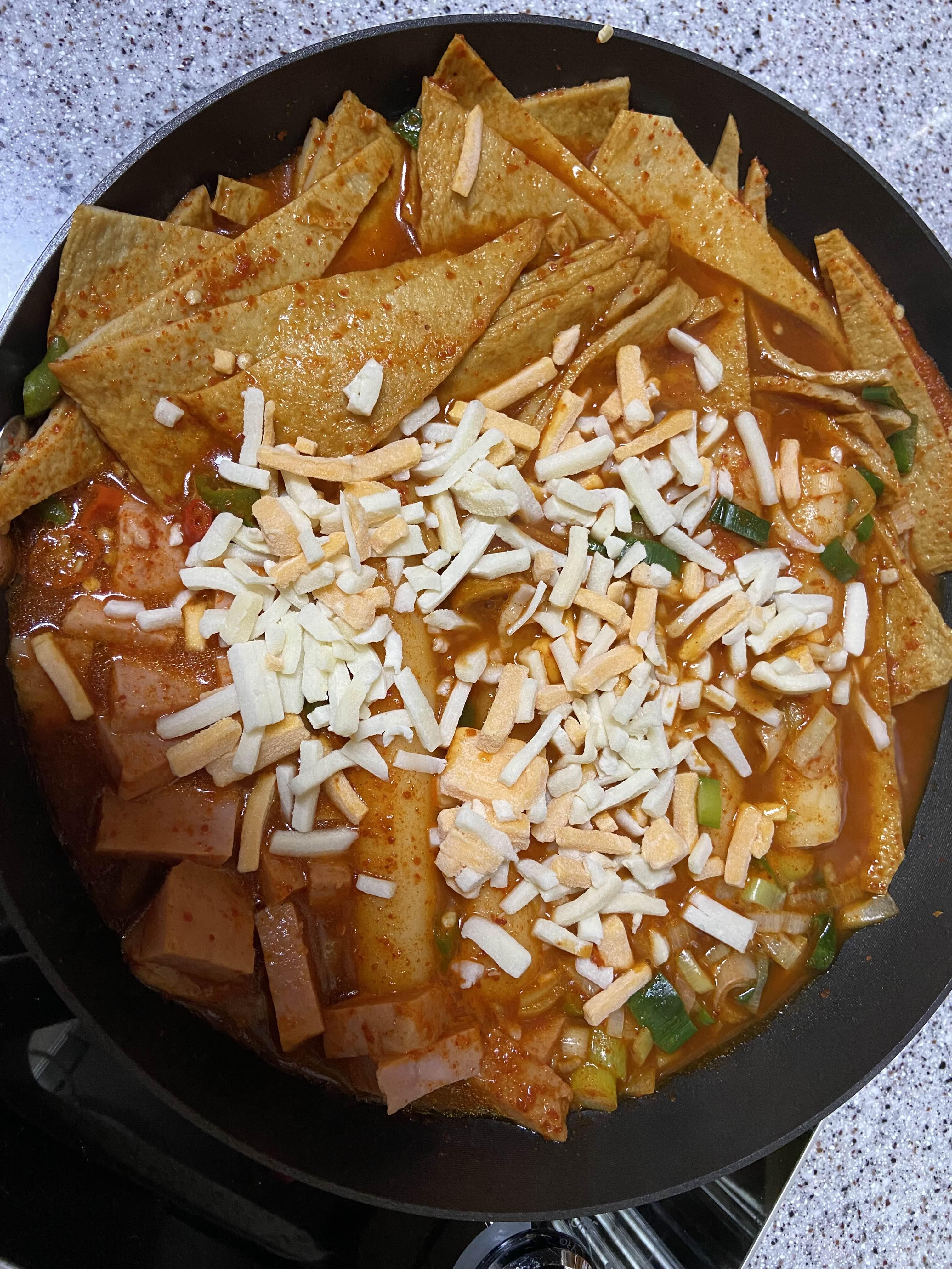 3. 준비해둔 재료를 싹 넣어줍니다. 스팸, 떡, 어묵, 대파 등등등. 양배추도 있음 넣으면 맛있겠당. 이 위에 치즈 듬뿍 올려서 녹여주면 완성!