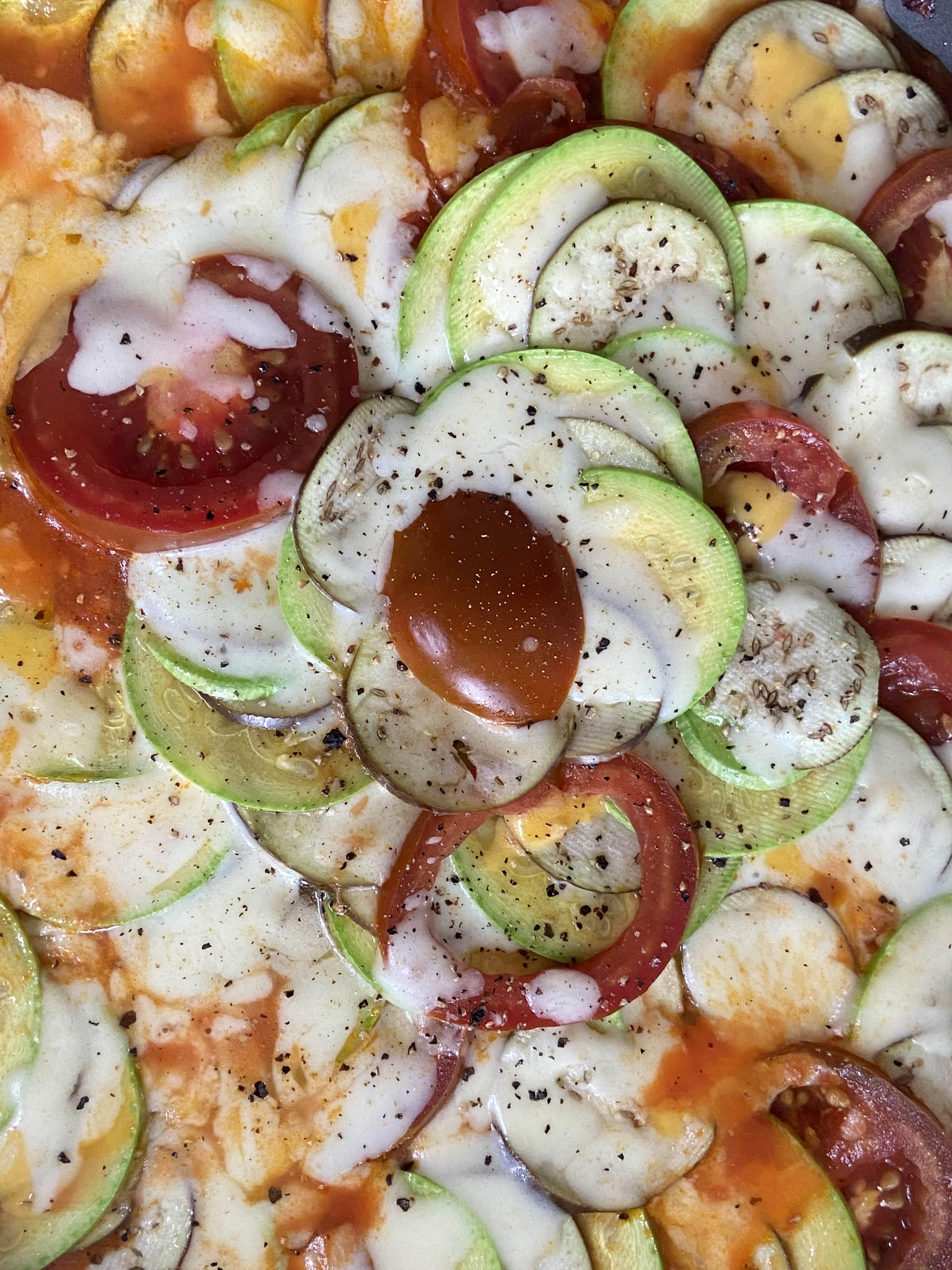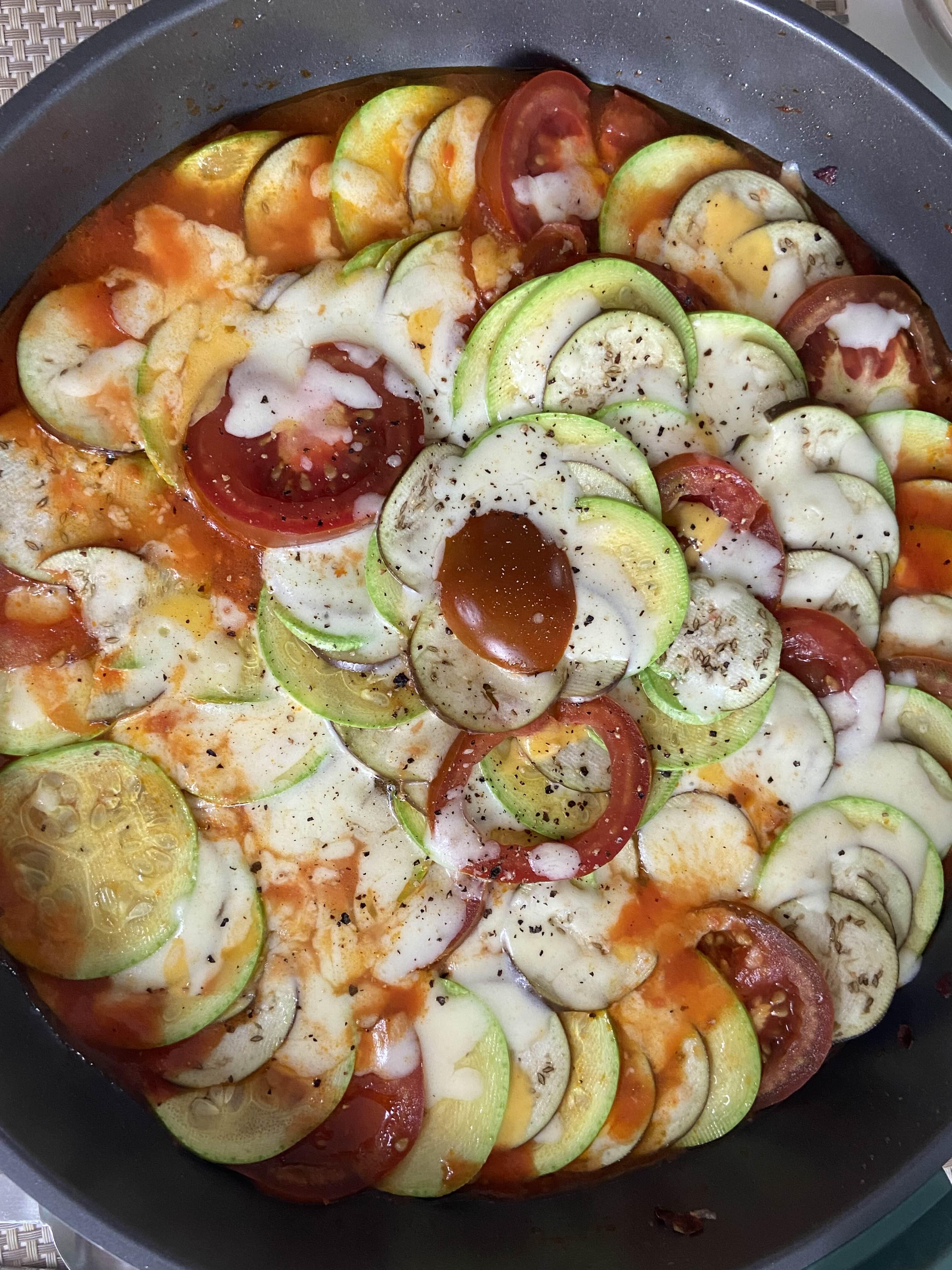 토마토소스 위에 가지, 토마토, 애호박을 겹쳐서 빙 둘러준다. 3분의 2씩 겹쳐주면 된다. 이 때 못생기게 자른 것들은 숨겨줄 수 있다.