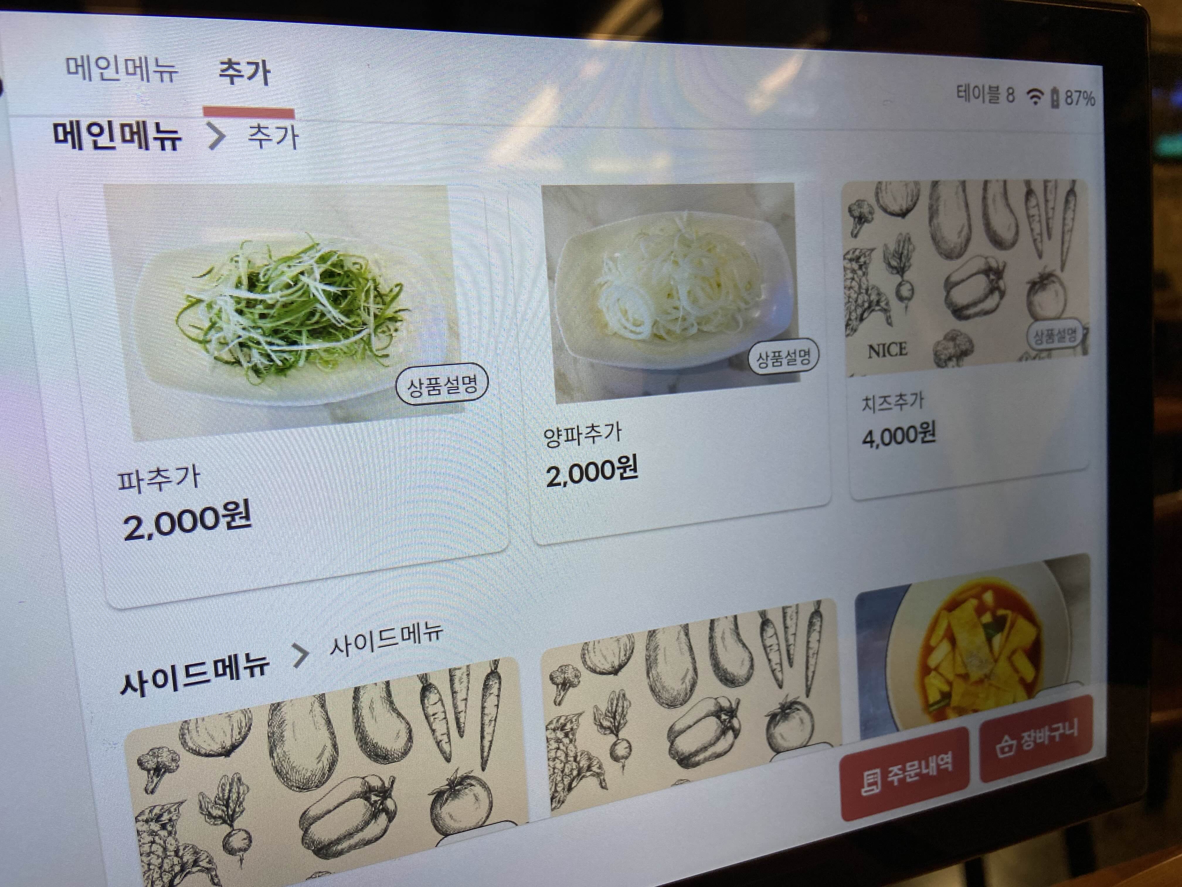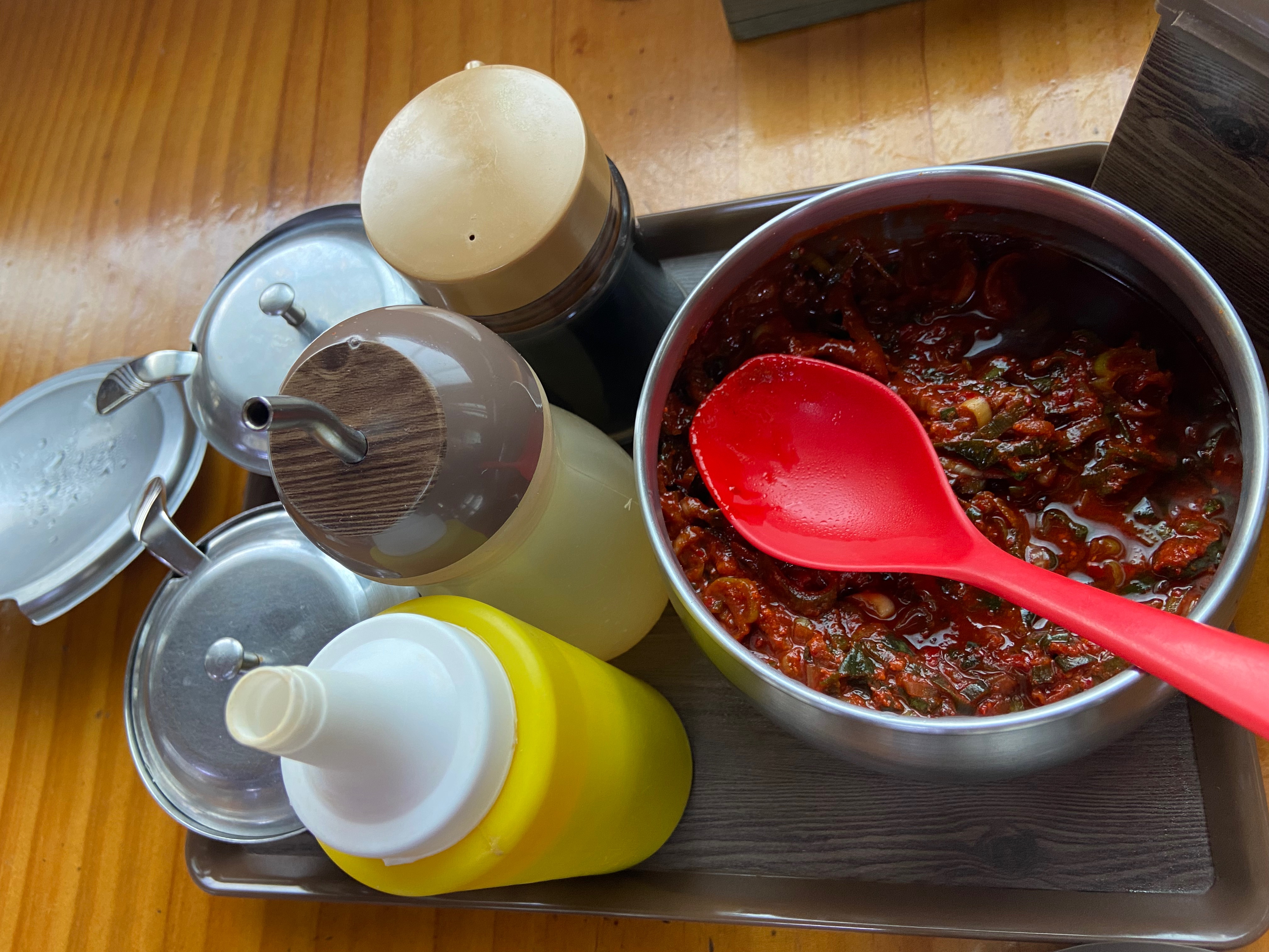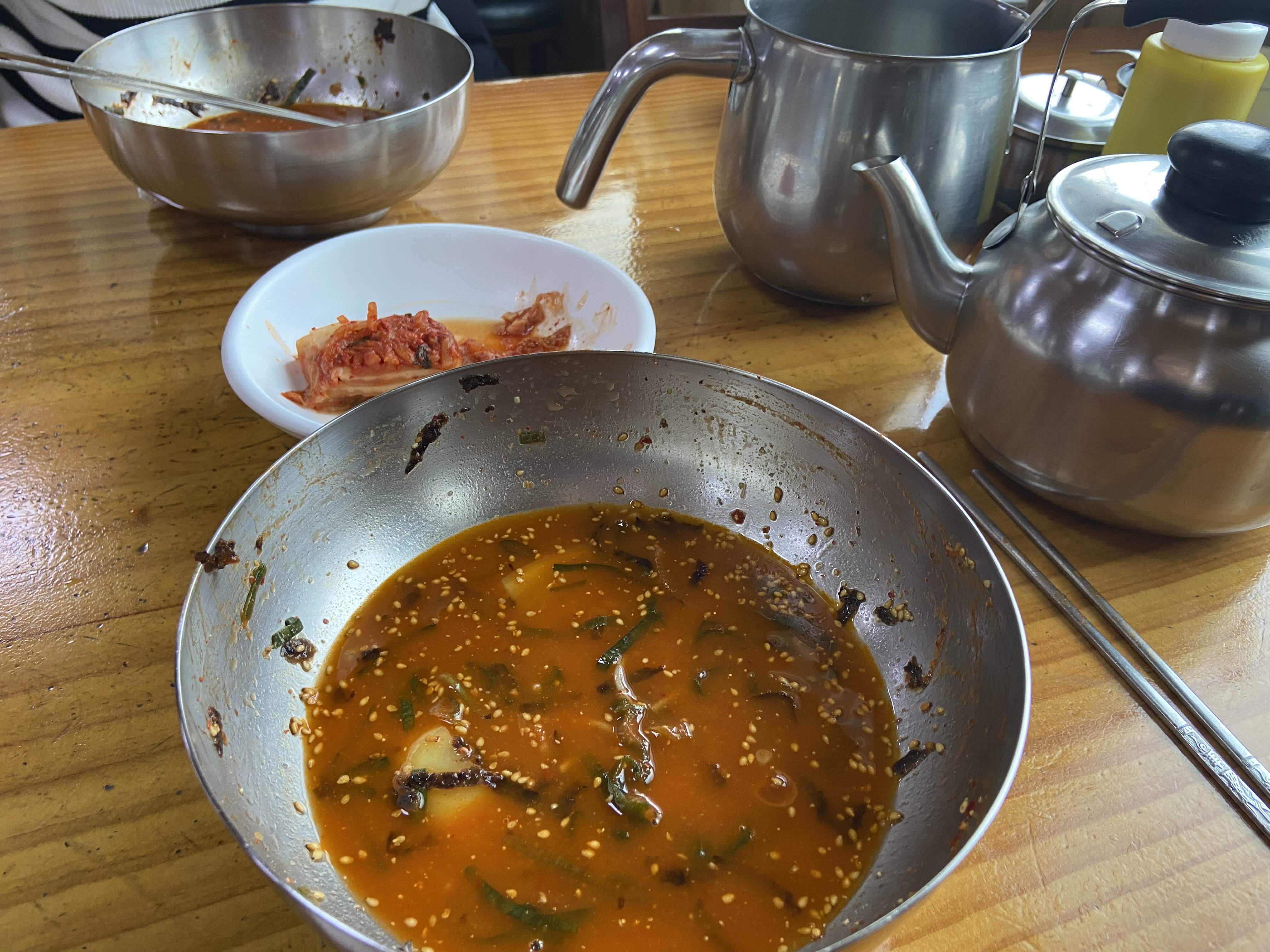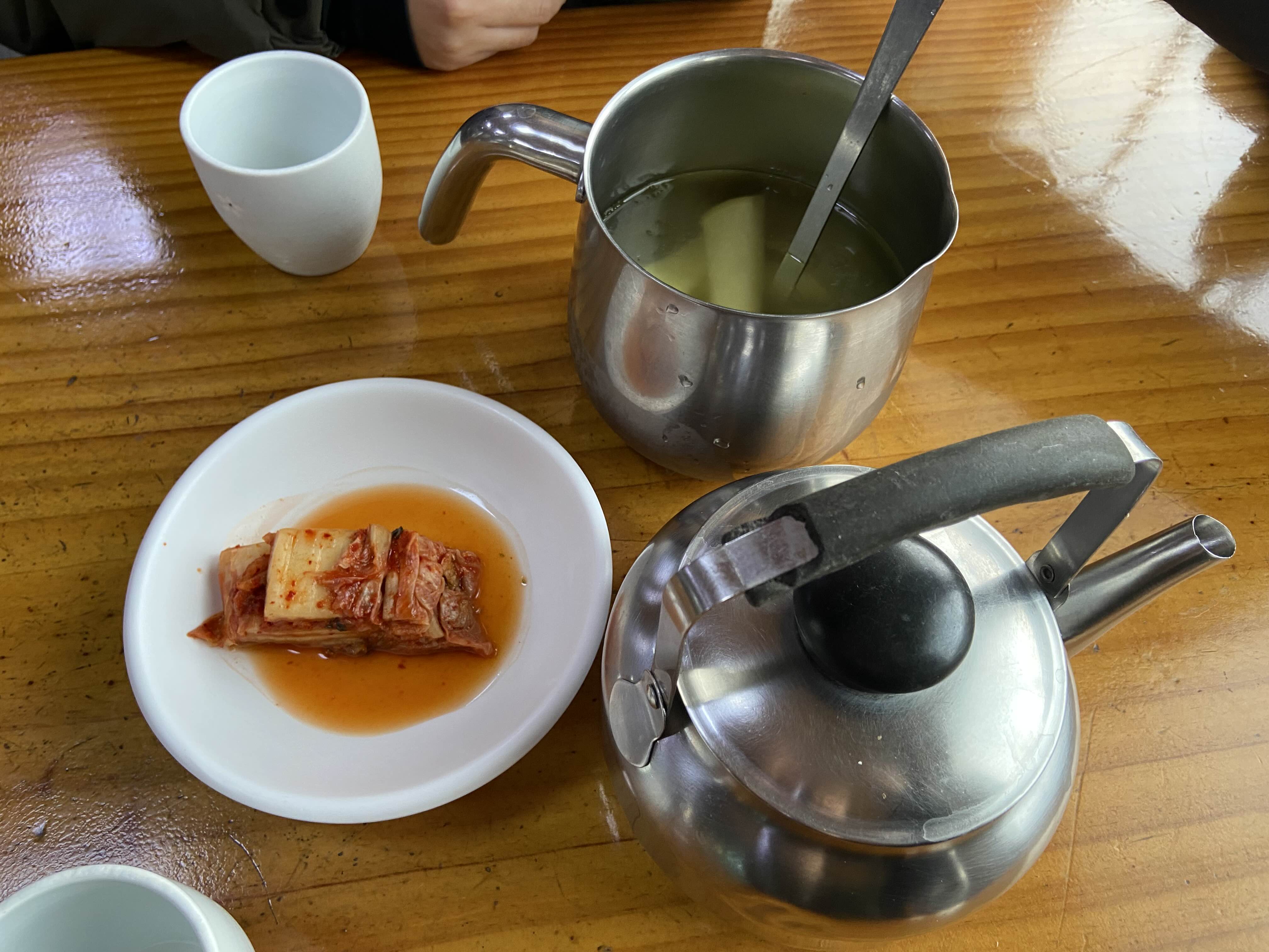 기본 반찬으로 나온 것들. 저 주전자에는 처음엔 냉면집 가면 주는 고기육수가 있는 줄 알았는데! 그냥 물은 아닌 뭔가 꼬수운 물 같은 것이 들어있었다.