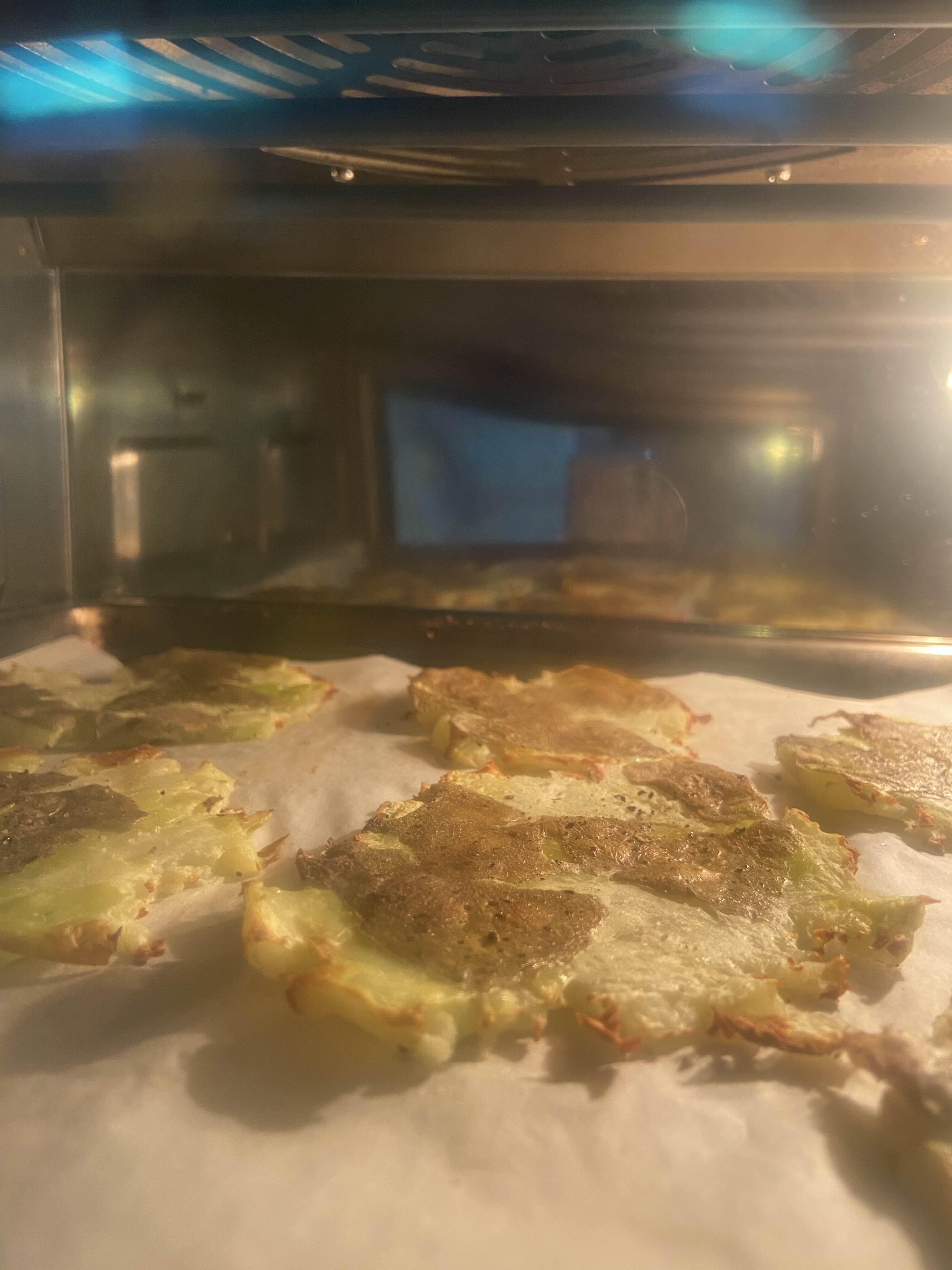 5. 이제 오븐 또는 에어프라이기에 구우면 된다. 그냥 구우면 윗면만 바삭하고 아래는 그냥 찐감자다. 그러니 중간에 한번 뒤집어주면 좋다.