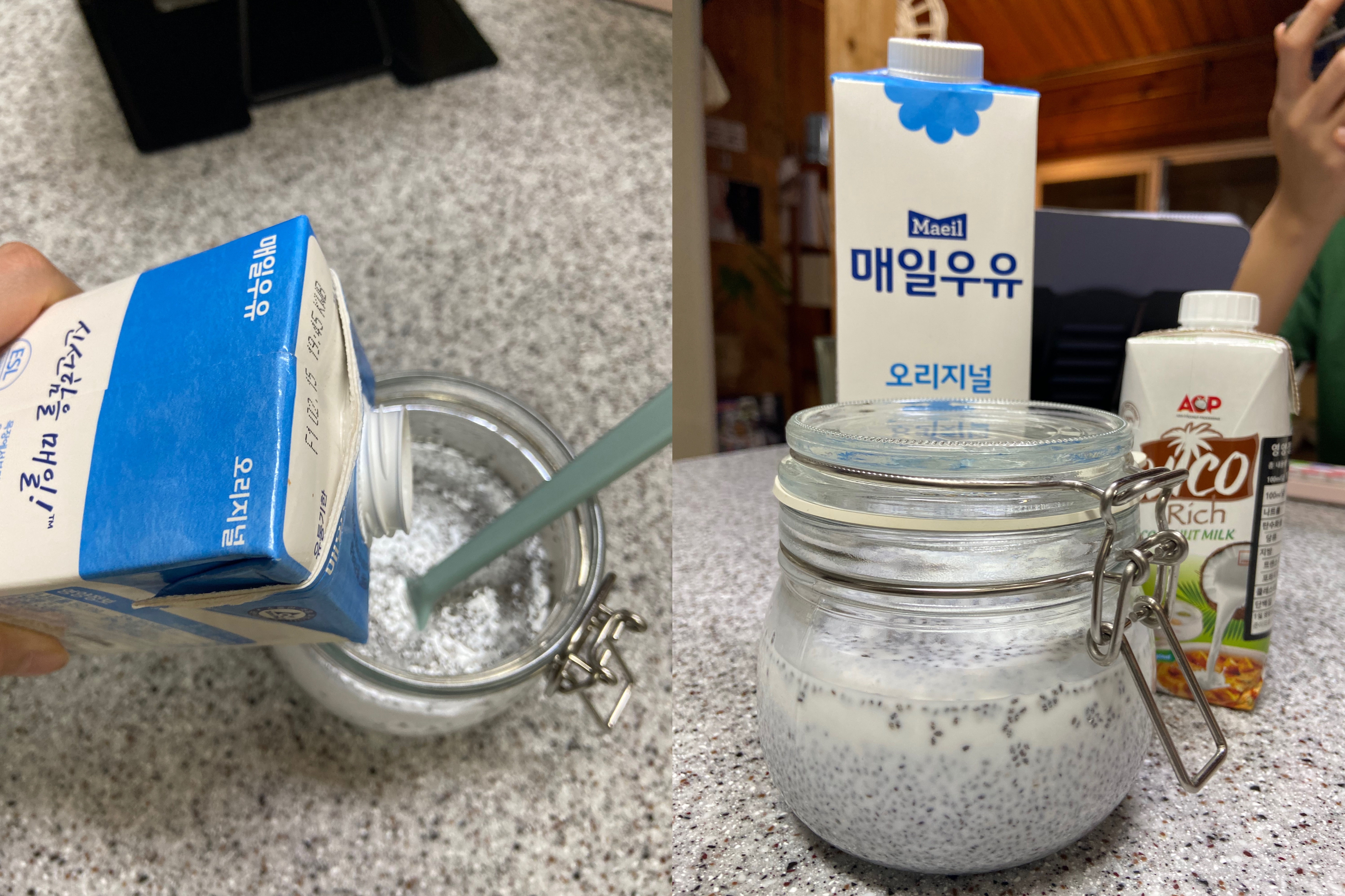 3. 그 다음은 우유! 캐슈넛밀크를 넣으면 아무래도 더 견과류 맛이 나면서 맛있겠지 싶다. 우유도 만드려는 양의 절반을 넣어주면 된다. 꾸덕하게 먹고 싶으면 액체류의 양을 줄이고, 묽게 먹으려면 우유를 많이 넣으면 되는데 나는 먹다보니 묽은 제형이 좋아서 우유를 더 넣어주고 있다. 우유를 넣고 또 골고루 섞어준다. 이 때, 꿀을 함께 넣으면 달달하게 만들어진다. 어떤 분은 바나나를 으깨서 넣어서 바나나 치아씨드 푸딩을 만들었다. 나는 일단 기본으로 만들고 위에 토핑을 올려 먹는다. 이렇게 2~3시간 불려두면 된다. 저녁에 만들어두고 아침에 먹는 편이다.