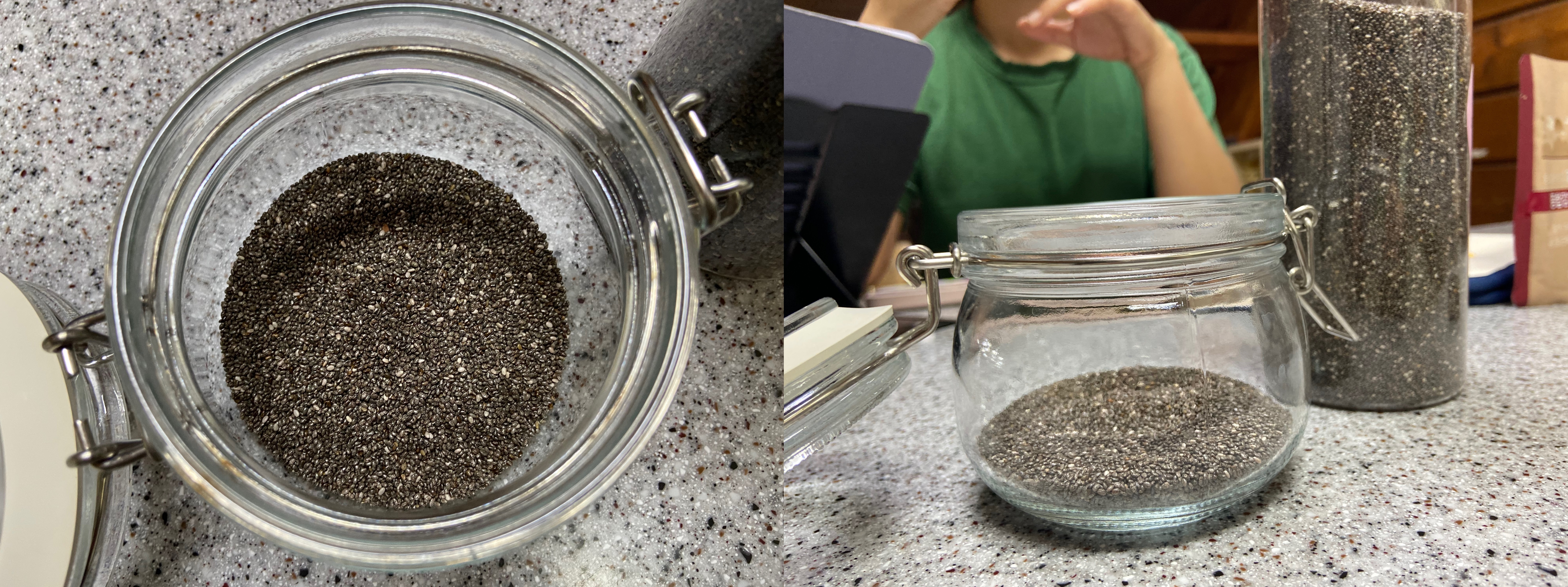 1. 통에 치아씨드를 담는다. 조금만 넣어도 불어서 양이 늘어나기 때문에 만드려는 양의 1/5만큼만 넣어준다. 통에 바닥정도 깔아준다는 느낌.