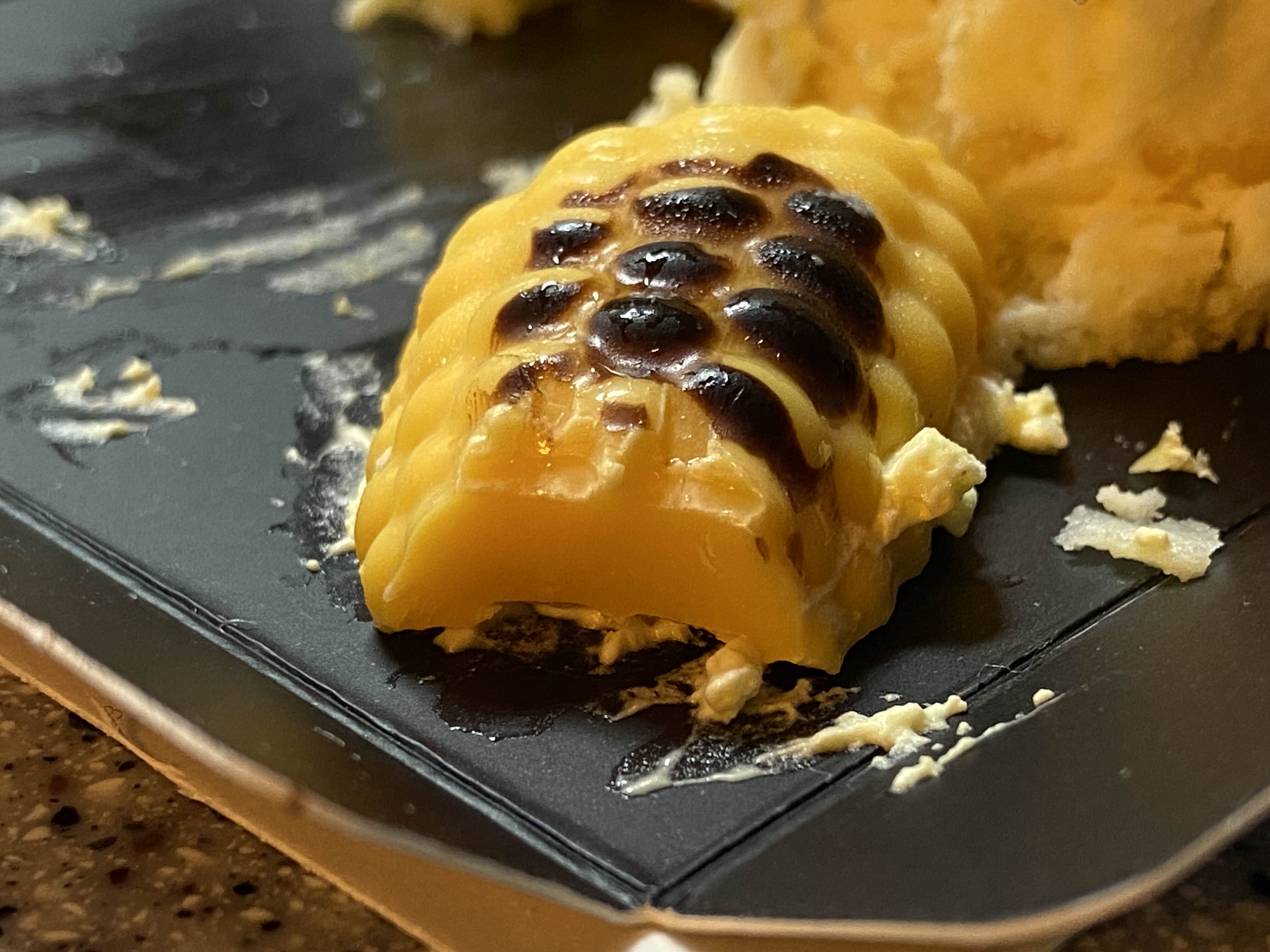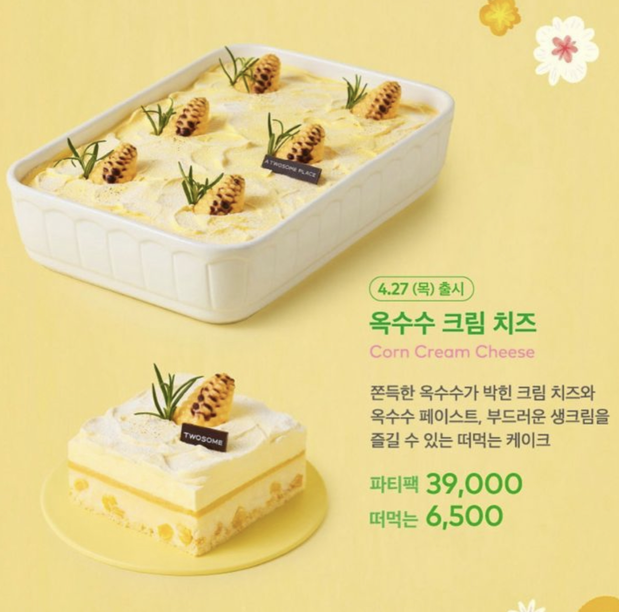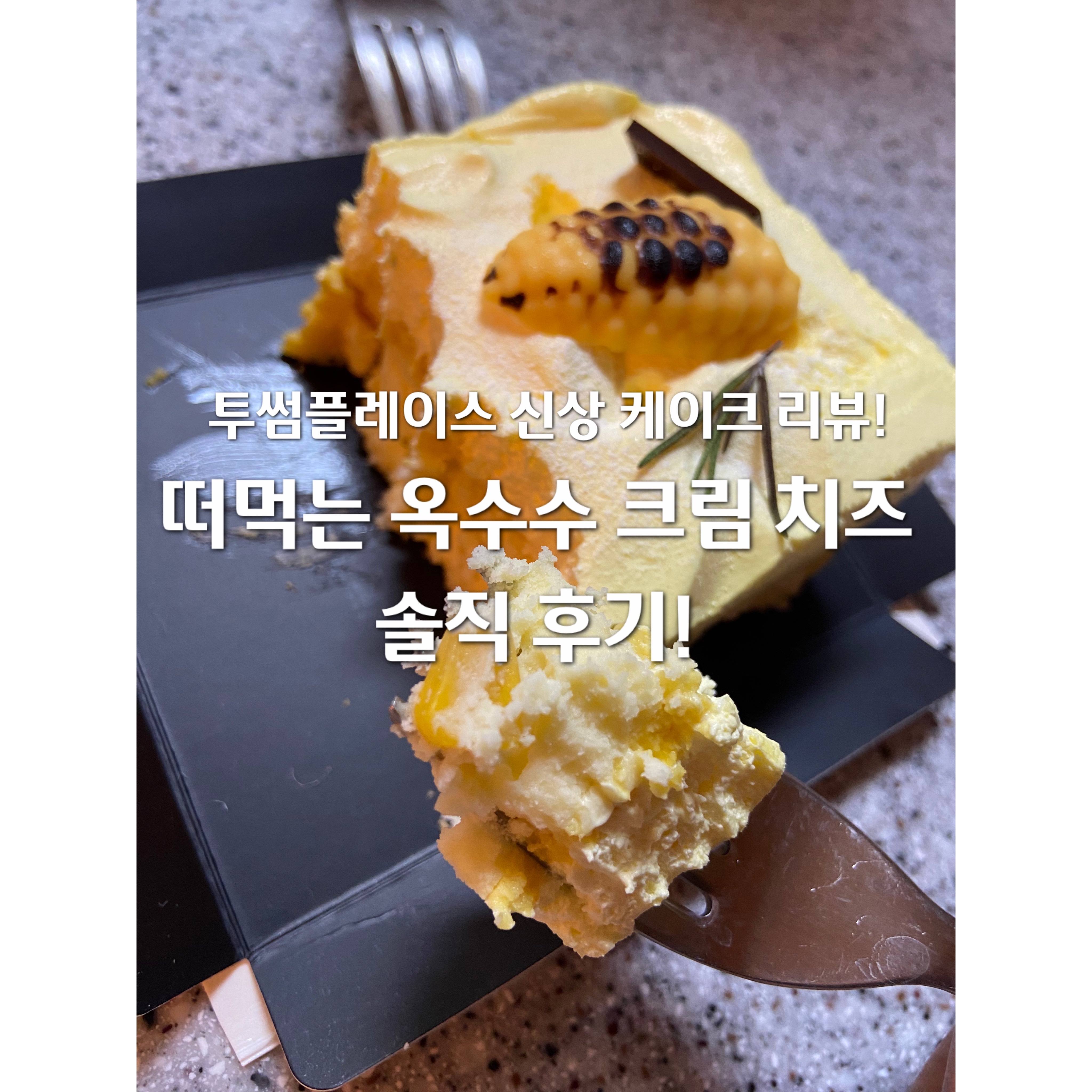 맨 아래는 아주 얇게 스펀지 시트가 깔려있고 그 위에는 치즈케이크에 옥수수 알갱이가 들어있다. 그 위에 노란 층은 옥수수 퓨레같은게 깔려있고 그 위에 덮인 크림은 그냥 생크림이 아닌 옥수수 크림이다. 뭔가 파스스 기포가 생기는 느낌의 생크림!