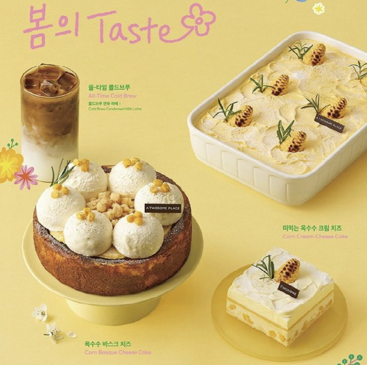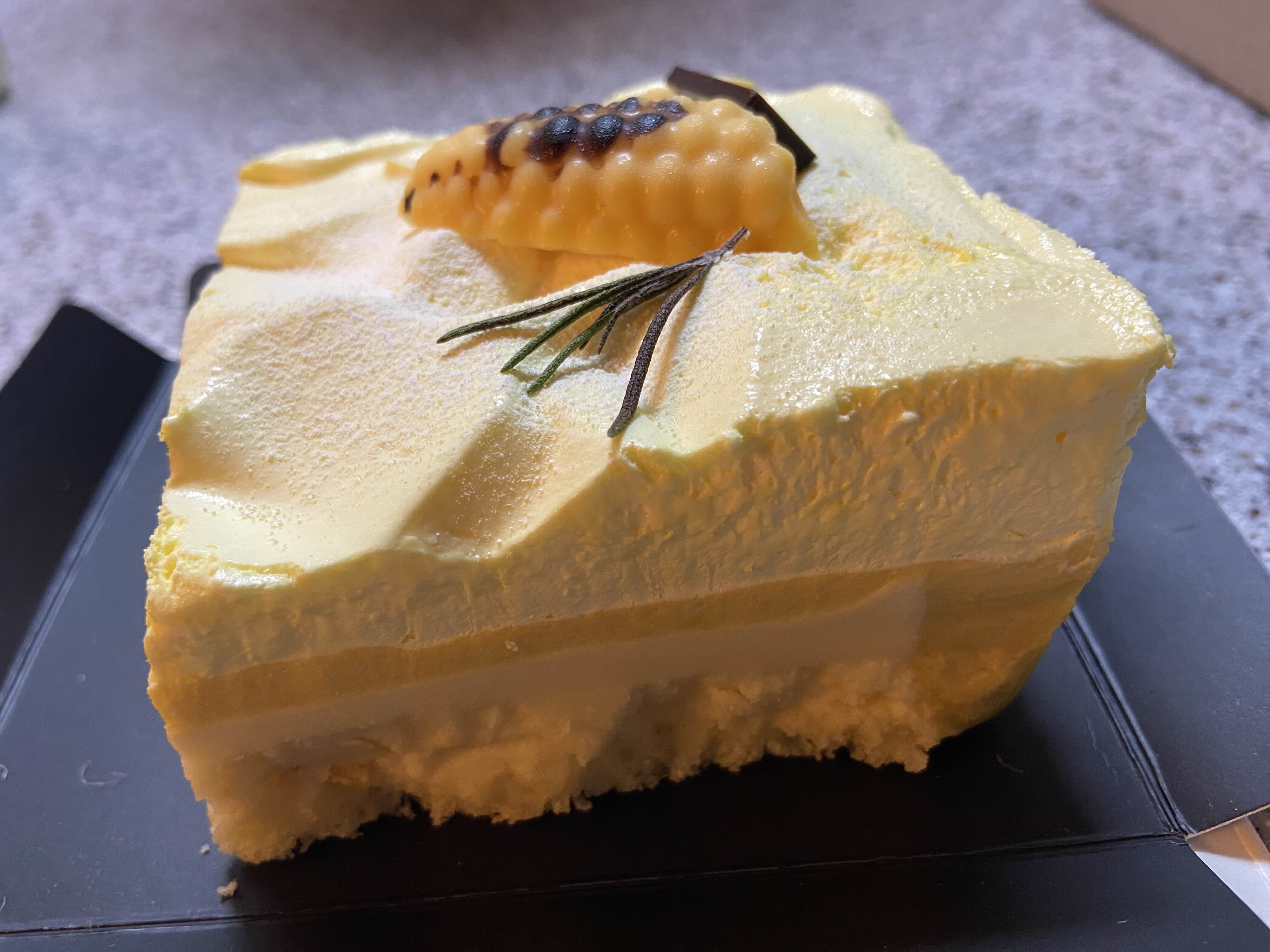 맨 아래는 아주 얇게 스펀지 시트가 깔려있고 그 위에는 치즈케이크에 옥수수 알갱이가 들어있다. 그 위에 노란 층은 옥수수 퓨레같은게 깔려있고 그 위에 덮인 크림은 그냥 생크림이 아닌 옥수수 크림이다. 뭔가 파스스 기포가 생기는 느낌의 생크림!
