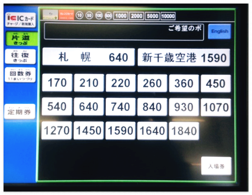 와이파이 도시락이나 유심을 단디 챙겨왔으면 구글 맵으로 보고 가면 된다. 공항에 내려서 JR라인 표지판을 따라 가면 지하철 표를 끊는 곳이 나온다. 지하철 표를 끊는 기계에 파란색 버튼으로 된 English로 보는 걸 클릭하면 되고, 위의 사진처럼 삿포로 역으로 가는 버튼은 위에 크게 나와있다. ( 저 요금은 아님, 다른 곳 사진이다.) 사진 속에 큰 버튼 두개 중에 왼쪽의 글자가 일본어로 삿포로 표기이고, 오른쪽이 신치토세 공항이 표기되어있다.