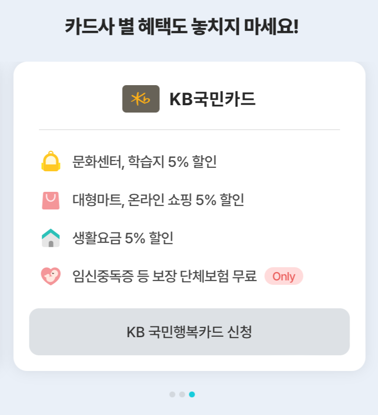 이전 이야기.... 내가 저번에 포스팅할 때... 국민행복카드는 마미톡에서 바로 들어가서 카드사 별로 만들 수 있다고 간편하게 말했었다. 그래서 카드 발급하고, 카드사에서 직장에도 연락해서