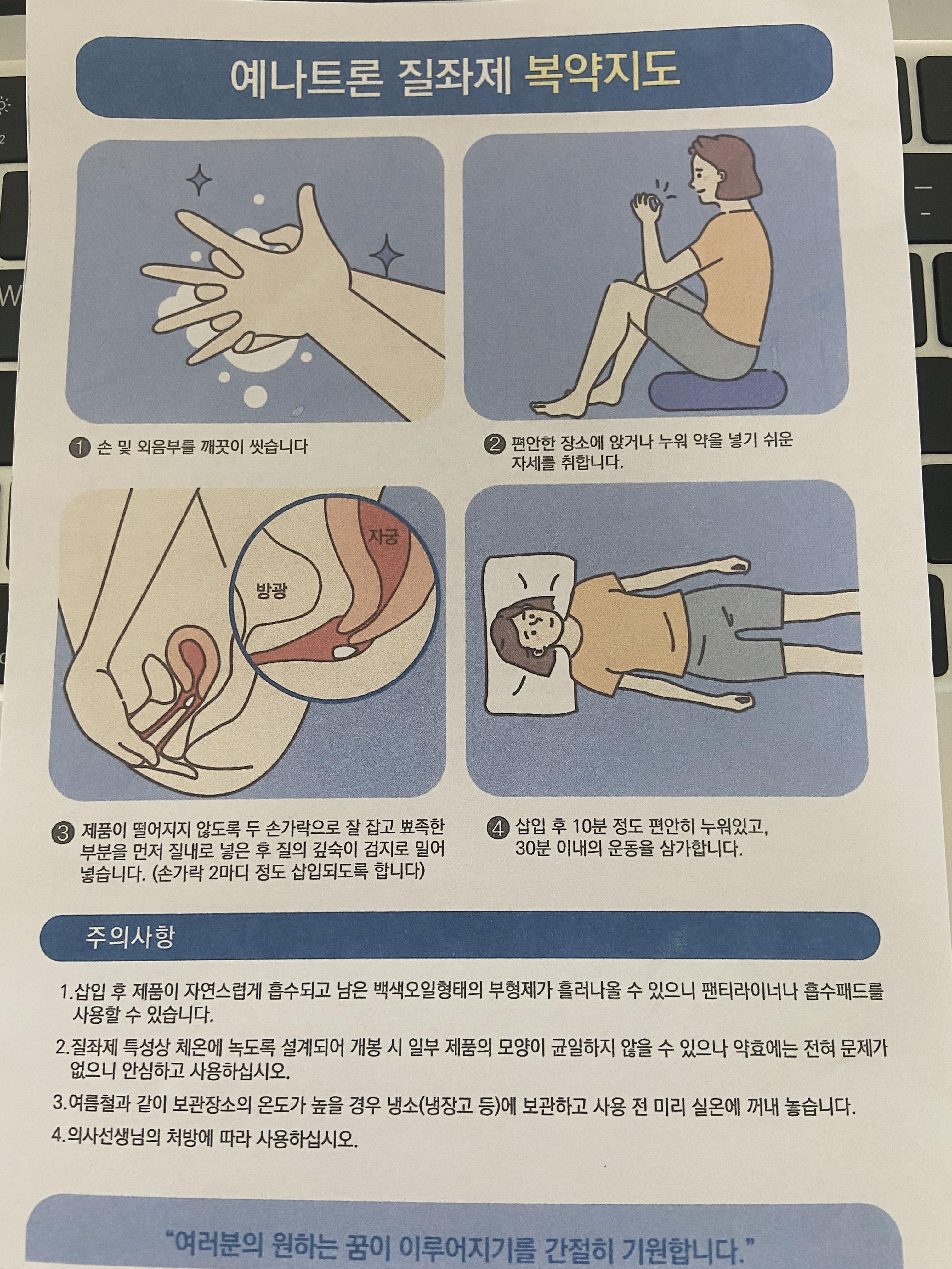 출혈이 있다고 말하니 질초음파로 확인하시고는 자궁 주변에 피고임은 보이지 않는다고 하셨다. 착상혈이 나오는 경우도 있다고 하시면서 질정을 일주일 넣으라고 처방해주셨다. 질정 이름은 예나트론질좌제(프로게스테론) 여성호르몬제이다.