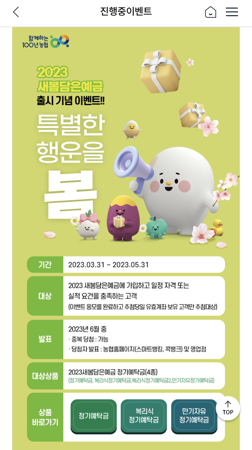 이 경품 이벤트는 새봄담은예금 출시 기념으로 진행된다. 2023.03.31~2023.05.31 기간 사이에 새봄담은예금에 가입하고 2023년 6월까지 예금 계좌를 보유하고 있으면 참여할 수 있다. 예금에 가입한 후 꼭! 별도로 이벤트 응모에 참여해야 하니 잊지 말고 응모하기!